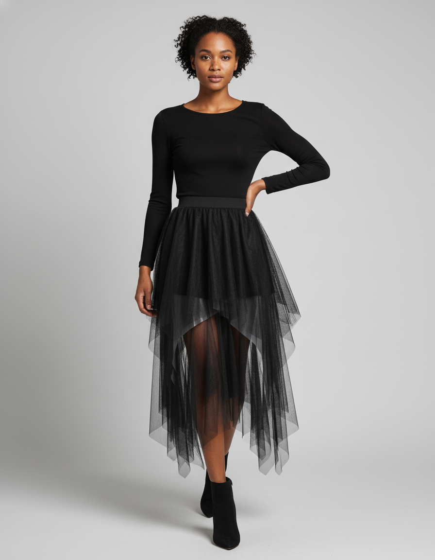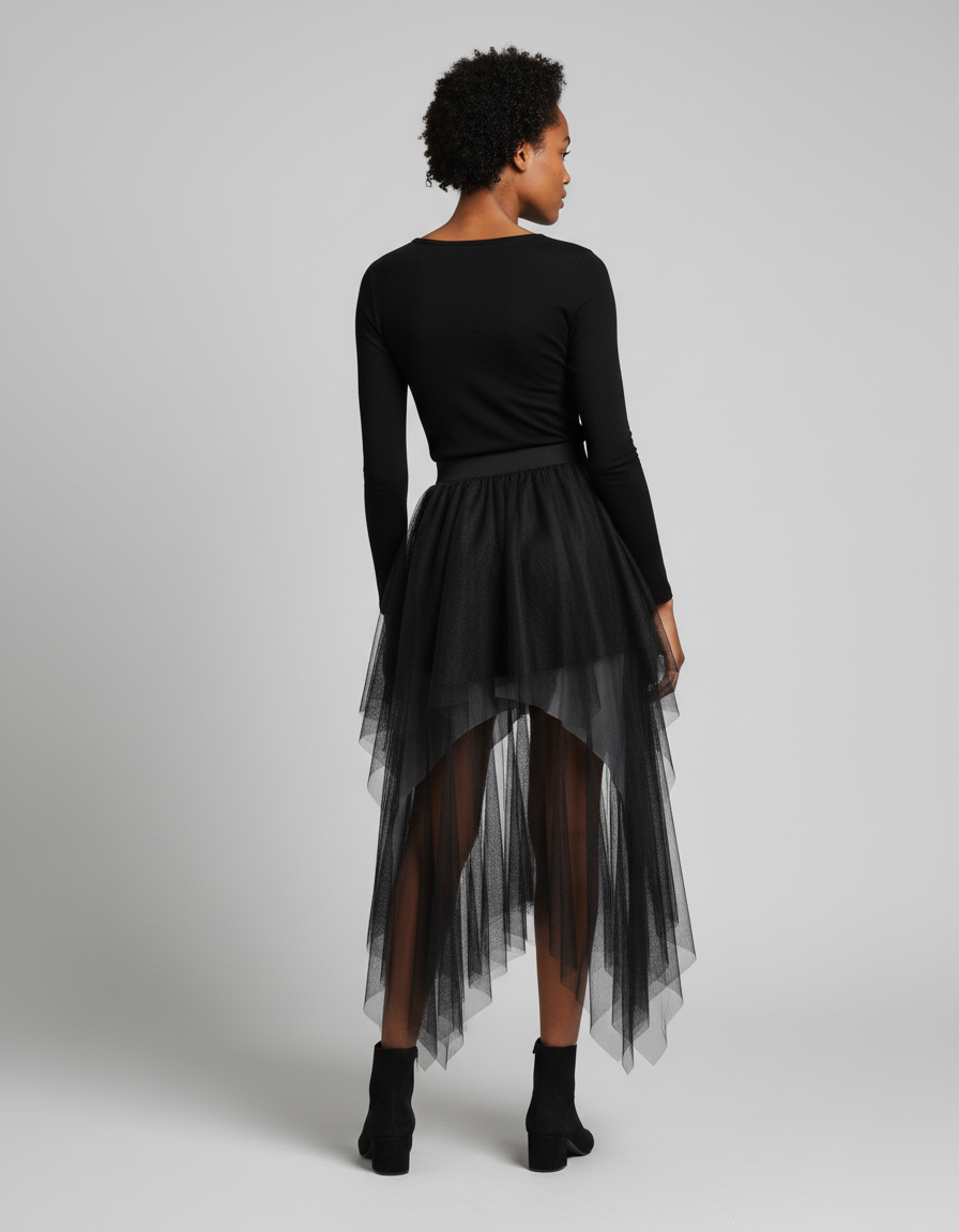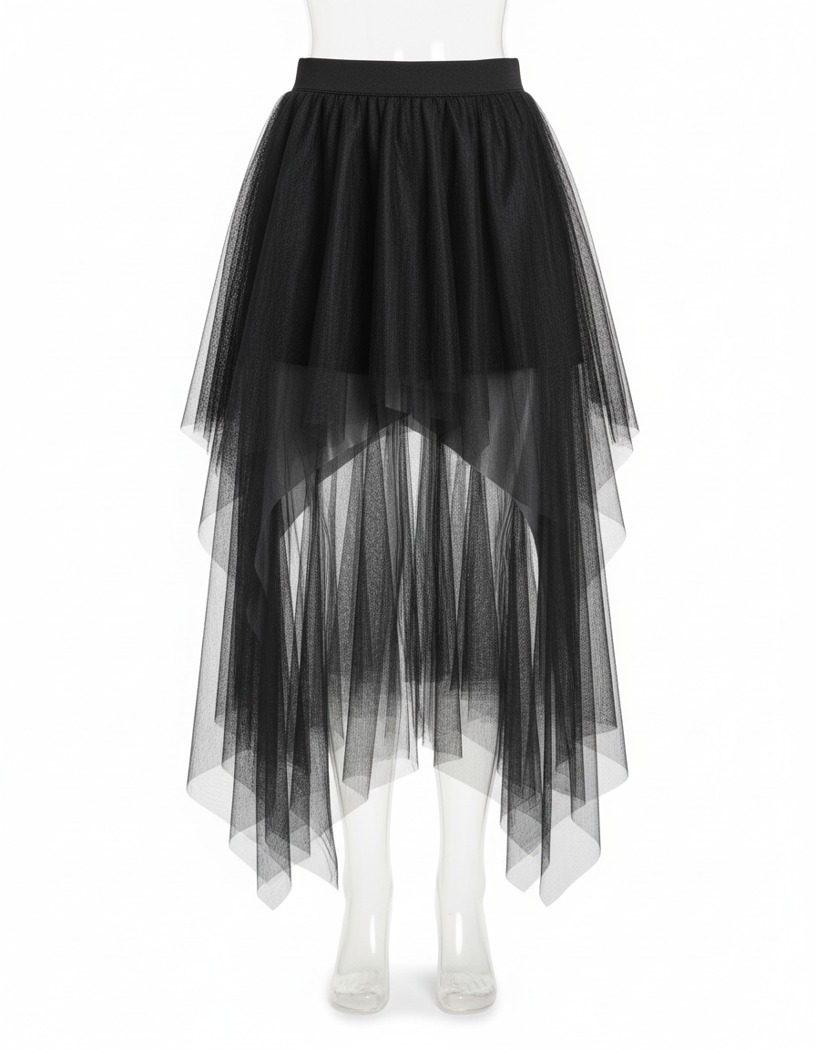 Adoptez une allure moderne et sophistiquée avec notre jupe asymétrique en tulle, parfaite pour toutes les occasions.