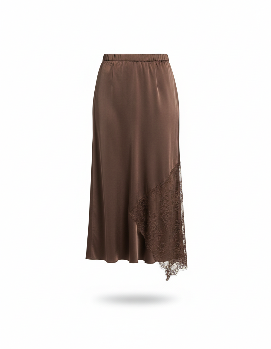 Ce qui distingue véritablement notre Jupe Asymétrique, c'est son design audacieux et raffiné. La coupe asymétrique, subtilement rehaussée d'une délicate bordure en dentelle ton sur ton, crée un jeu de transparence et de texture unique, ajoutant une touche de mystère et de sensualité. Loin des conventions, elle offre une silhouette dynamique et résolument moderne. Fabriquée dans un satin de haute qualité, sa couleur marron riche apporte une profondeur et une polyvalence qui s'harmonisent parfaitement avec diverses palettes. C'est la pièce qui transforme une tenue simple en une déclaration de style affirmée.