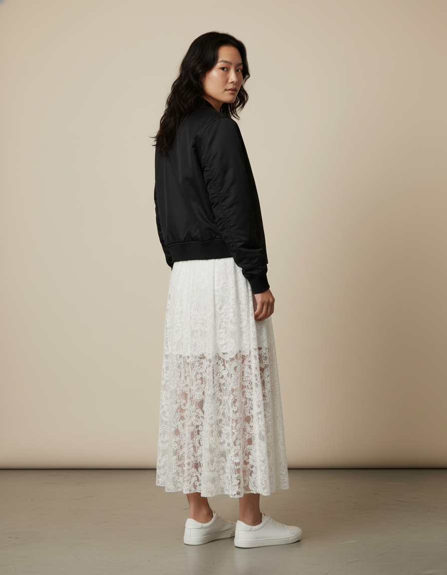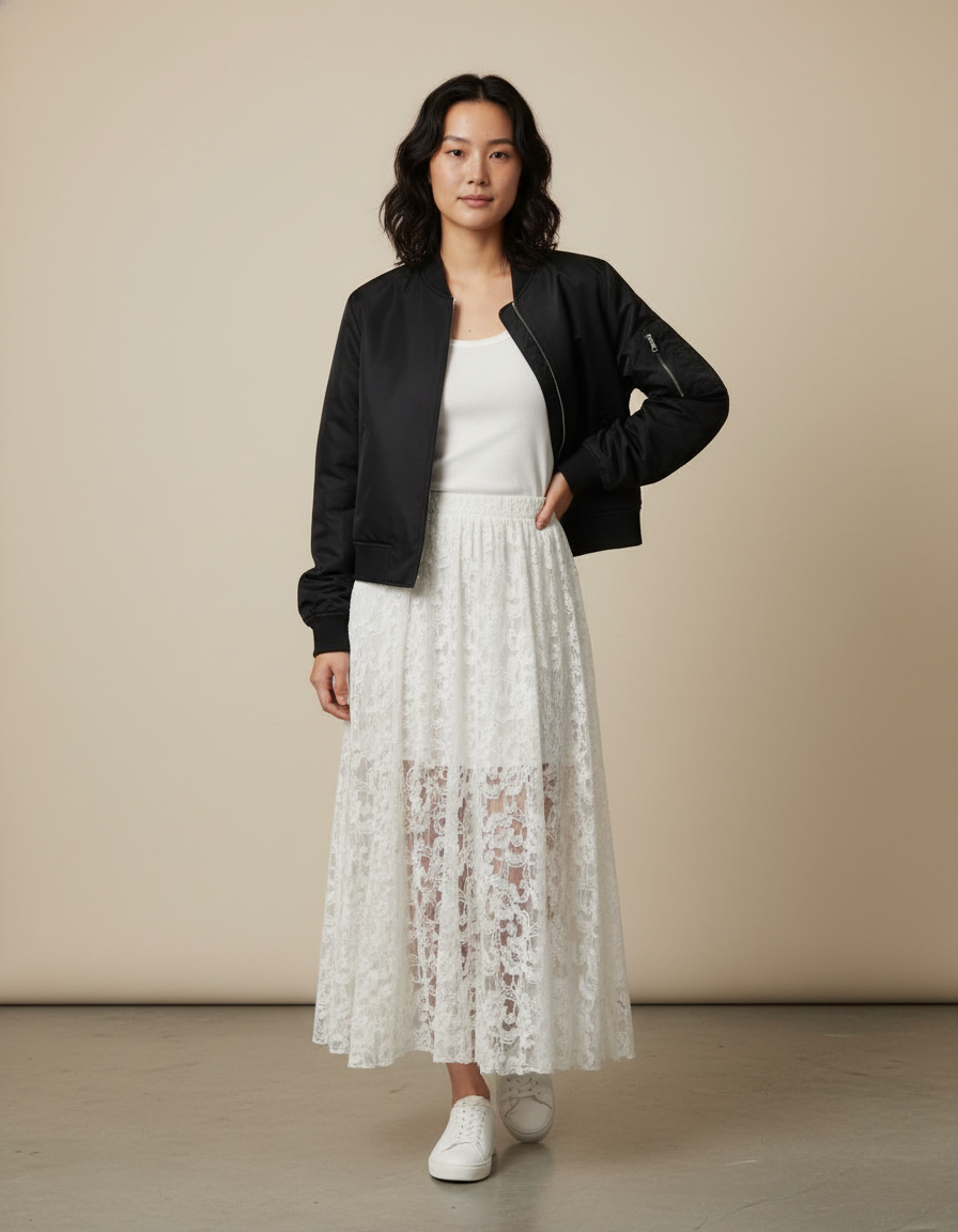 Découvrez notre Jupe Longue Blanche en Dentelle, une pièce maîtresse pour un été tout en légèreté et en sophistication. Sa taille élastique assure un ajustement parfait, tandis que sa coupe évasée en dentelle délicate offre une allure gracieuse et aérienne. Pour un look décontracté chic, associez-la à un simple débardeur blanc et des baskets immaculées, comme sur l'image. En soirée, elle se transforme en un clin d'œil avec une blouse en soie et des sandales à talons, ou pour un contraste audacieux, osez la veste bomber noire pour une touche urbaine raffinée.