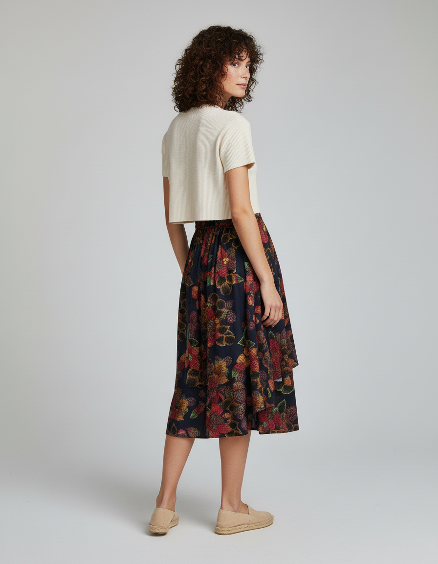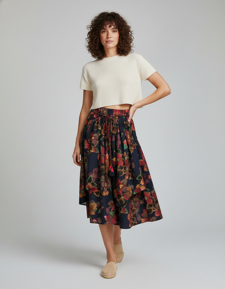 La jupe présente un fond sombre orné d'un motif floral multicolore. Sa coupe est fluide, avec un design à plusieurs niveaux et une taille ajustable par cordon.
