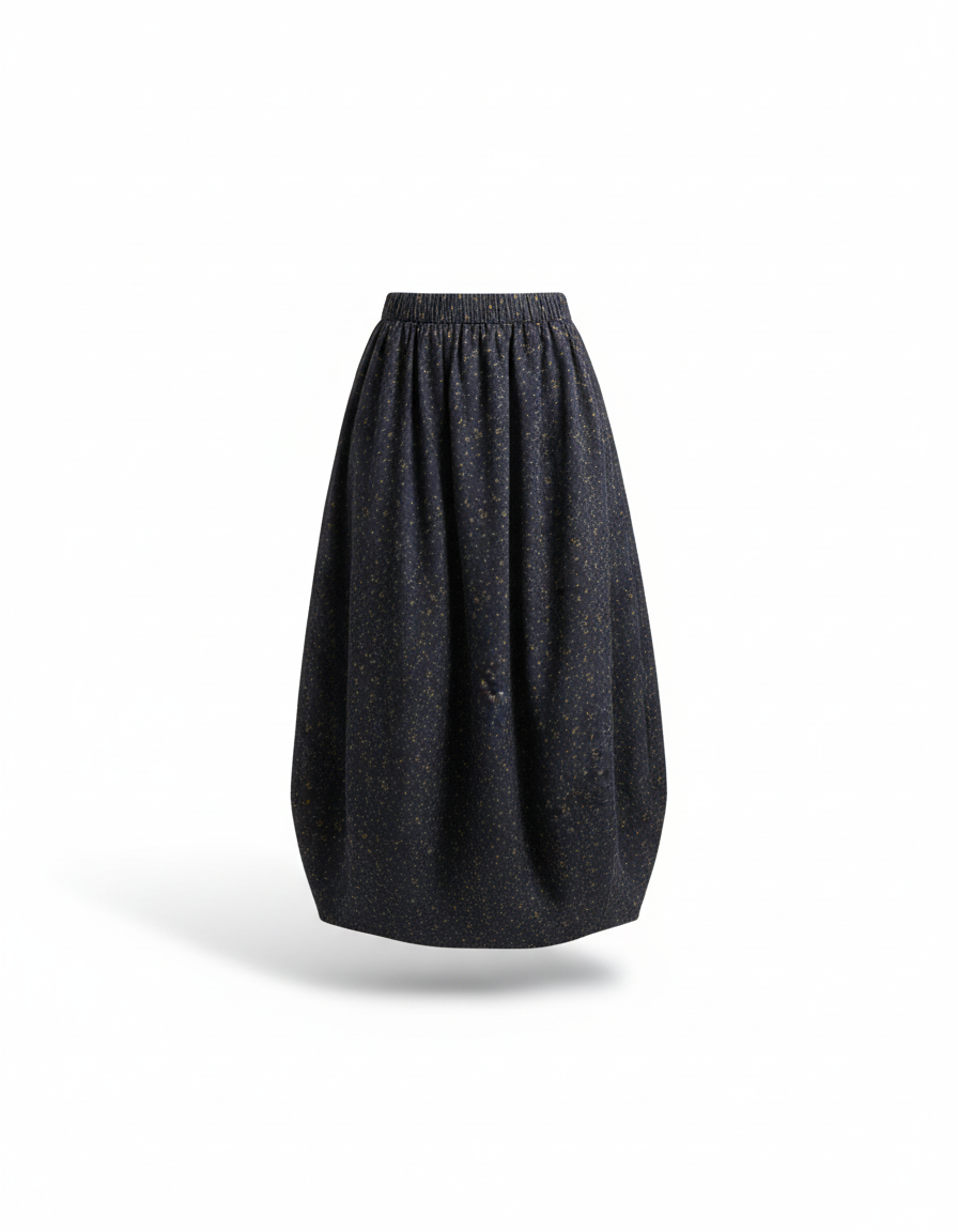 Cette jupe longue présente une coupe ample et arrondie, caractérisée par une taille élastique. Elle est dotée d'un motif moucheté sur un fond sombre.