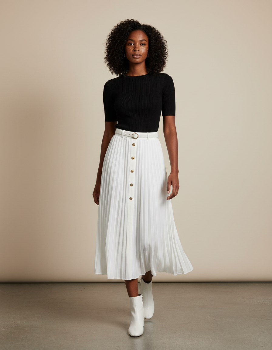 Optez pour l'élégance intemporelle avec notre jupe plissée boutonnée, parfaite pour toutes les occasions.