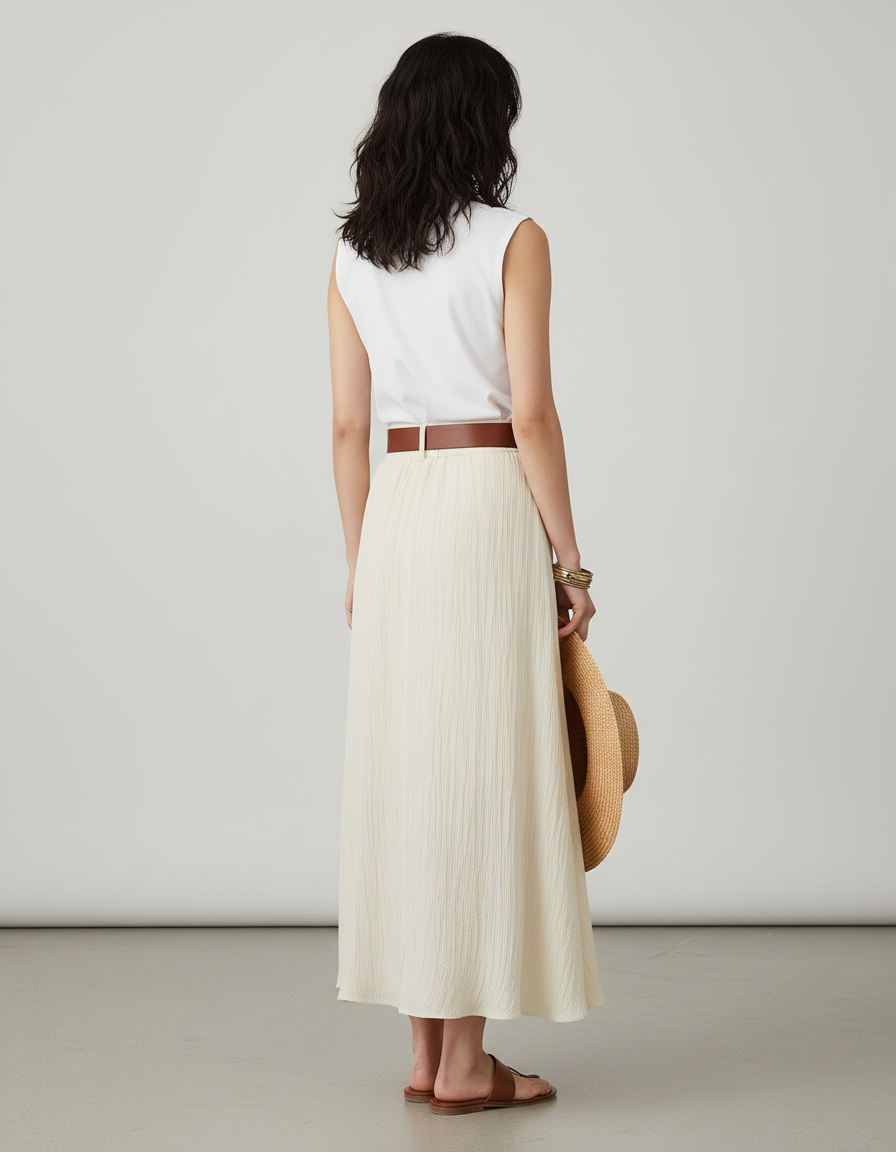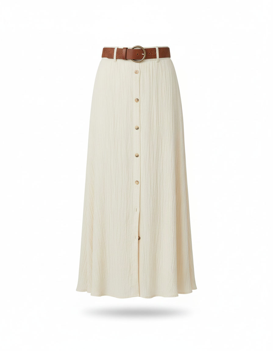 Conçue pour envelopper votre silhouette avec une grâce naturelle, notre Jupe Boutonnée Mi-Longue en beige fluide est la promesse d'un été stylé et confortable. Son tissu léger, à la texture délicatement froissée, caresse la peau et assure une aération parfaite, même les jours les plus chauds. Le tombé impeccable de sa coupe évasée offre une liberté de mouvement absolue, vous permettant de flâner en ville ou de vous évader en bord de mer avec une aisance incomparable. Chaque pas est une invitation à la légèreté, sans jamais compromettre l'allure premium.