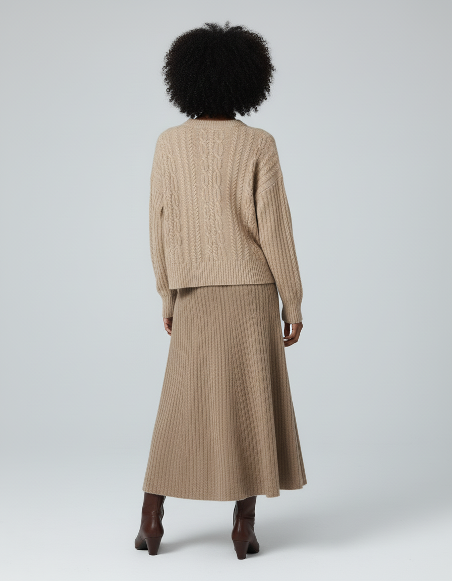 Sa teinte beige intemporelle en fait une pièce maîtresse versatile. Pour un look quotidien chic et décontracté, associez-la à un pull en maille torsadée et des bottines en cuir. Pour une allure plus sophistiquée, idéale pour le bureau ou un événement, optez pour un chemisier vaporeux et un blazer ajusté. En soirée, transformez-la avec un top en soie et des bijoux délicats pour une touche d'éclat. La Jupe Chaude Longue s'adapte à chaque occasion, affirmant un style moderne et une aisance absolue.