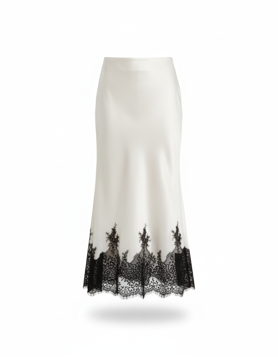 La jupe présente une coupe longue et une couleur claire. Elle est caractérisée par une bordure en dentelle noire au niveau de l'ourlet.