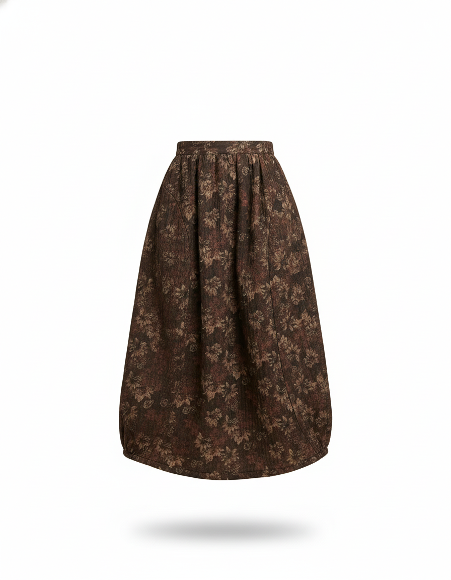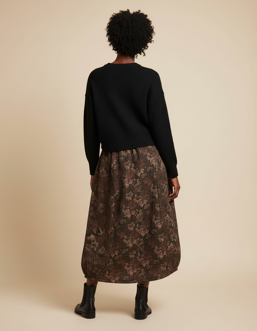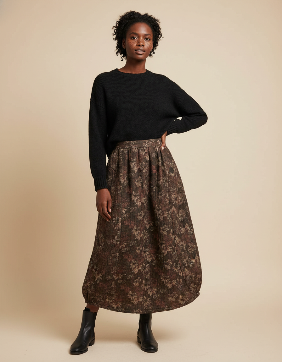 Sa palette de couleurs profondes et son motif floral délicat, subtilement "coloré" par des nuances terreuses, en font une toile de fond parfaite pour une multitude de styles. Pour une journée de travail élégante, associez-la à un pull en cachemire noir et des bottines en cuir. Le week-end, osez la décontraction chic avec un col roulé fin et des bottes hautes. En soirée, transformez-la avec un chemisier en soie et des bijoux dorés. La Jupe Corolle Longue est l'incarnation d'un luxe discret et versatile, promettant une allure unique en toute occasion.