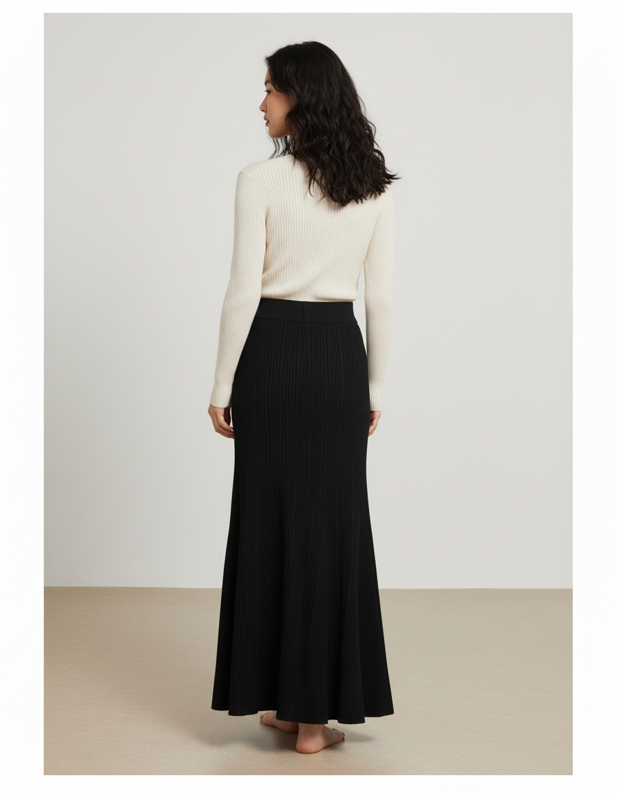 Découvrez notre Jupe Côtelée Longue, une pièce maîtresse de votre garde-robe hivernale. Confectionnée dans une maille noire finement côtelée, elle épouse délicatement les courbes pour une silhouette élégante et allongée. Son style moulant se prolonge en une légère évasée, offrant une allure sophistiquée et intemporelle. Parfaite pour la saison froide, cette jupe haut de gamme incarne le chic sans effort, prête à transformer chaque tenue en une déclaration de style.