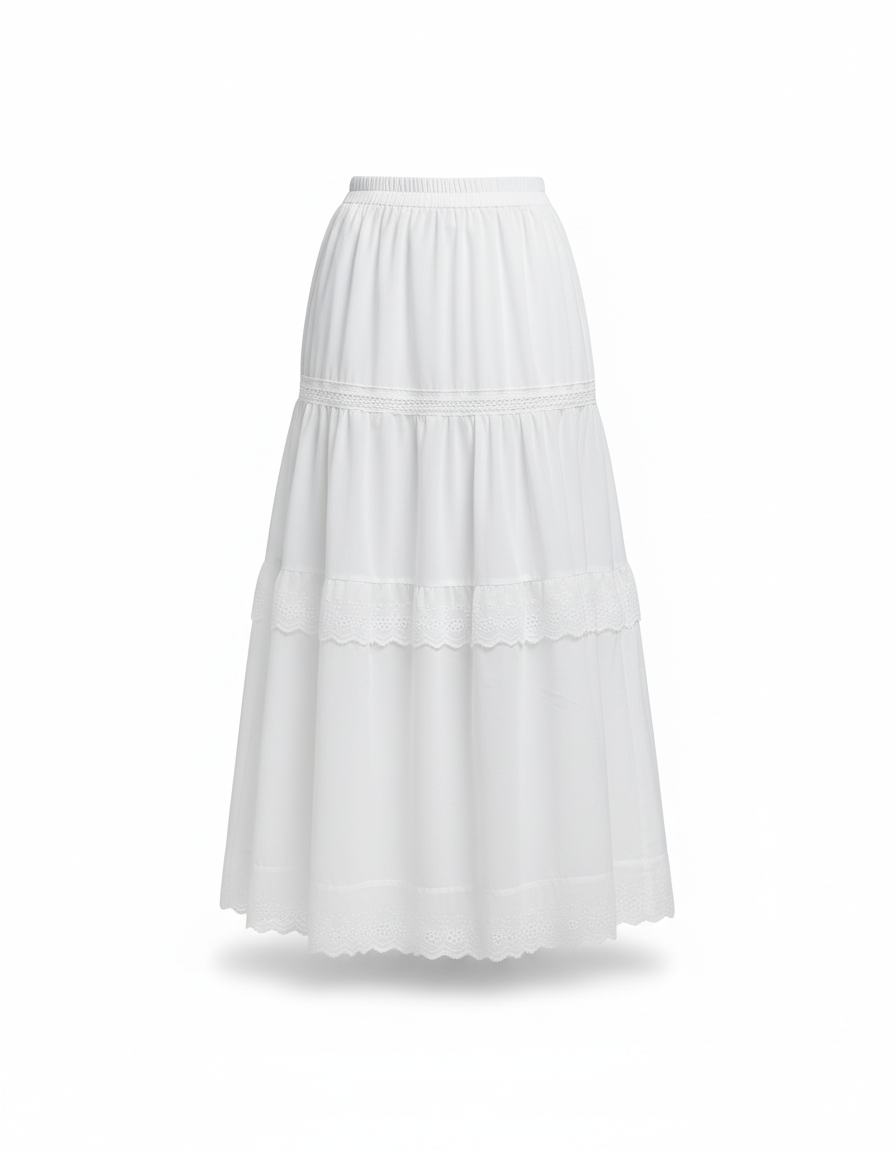 Cette jupe présente une coupe longue et évasée, confectionnée dans un tissu blanc. Elle est structurée en plusieurs niveaux ornés de détails en broderie.