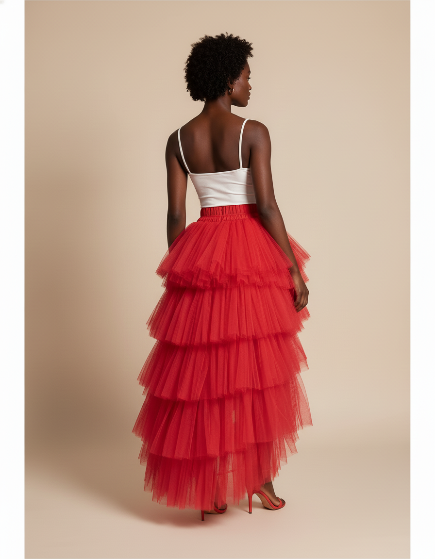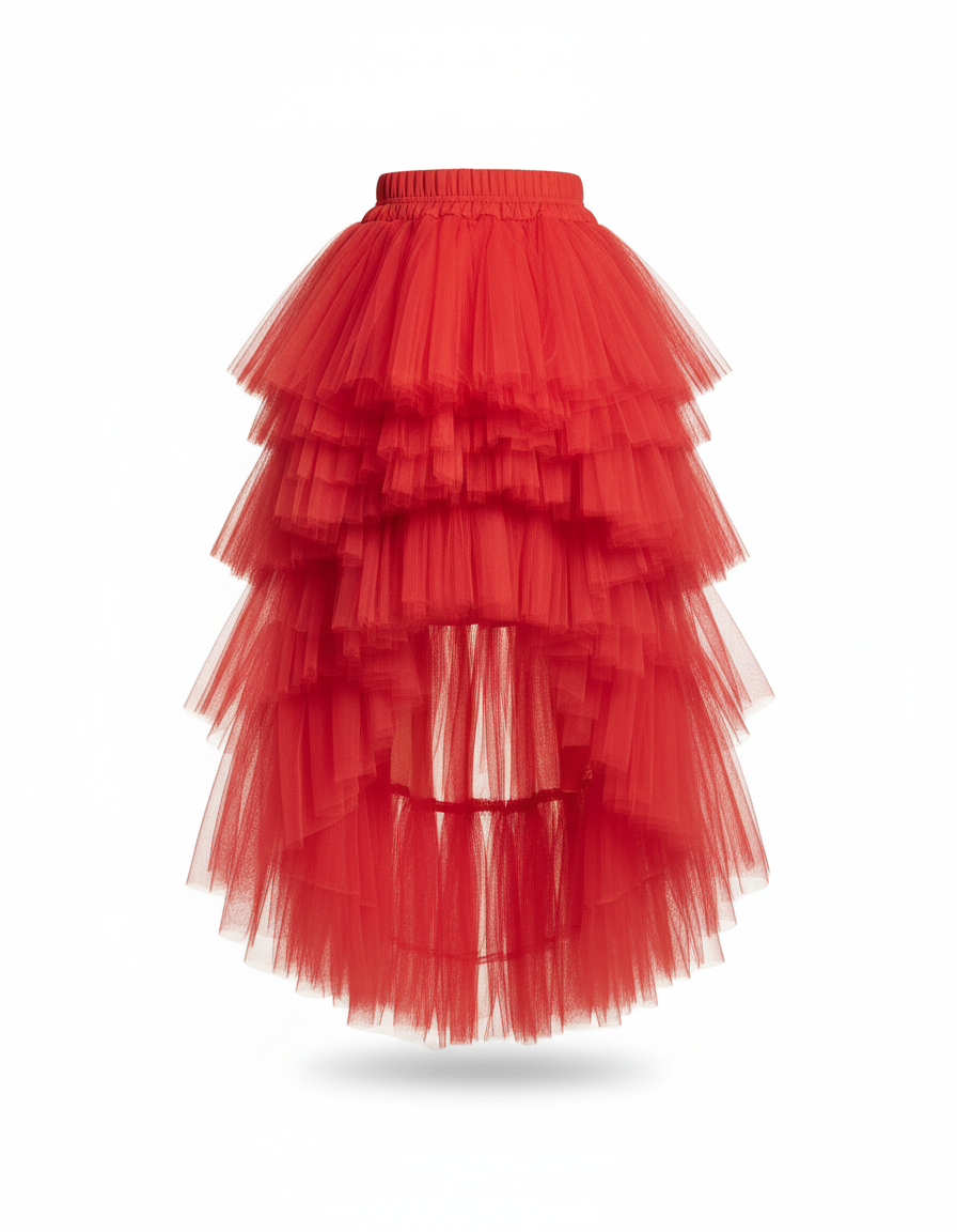 Ce qui distingue notre jupe, c'est son design asymétrique magistral, où des volants de tulle aérien se superposent pour créer un volume spectaculaire. Courte à l'avant pour révéler la jambe avec finesse, elle s'allonge majestueusement à l'arrière, offrant un mouvement gracieux et dramatique à chaque pas. Sa teinte rouge intense n'est pas qu'une couleur, c'est une déclaration vibrante de style. Une pièce maîtresse qui allie audace contemporaine et sophistication intemporelle, conçue pour celles qui osent se démarquer.