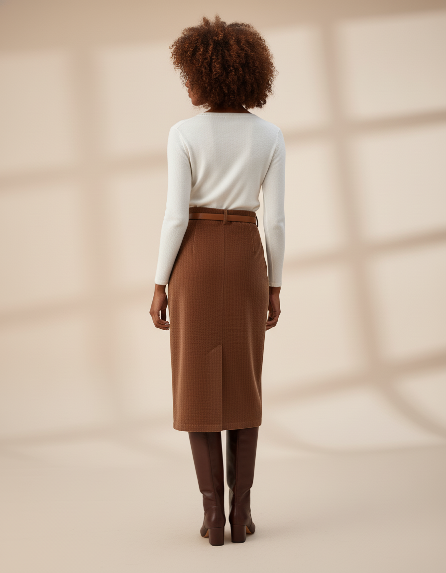 Ce qui distingue notre Jupe Crayon, c'est son velours côtelé d'une richesse incomparable, offrant une texture douce et un tombé impeccable qui flatte toutes les morphologies. Sa teinte marron profonde est facile à associer, tandis que la fente discrète apporte une touche de modernité et de sensualité maîtrisée, facilitant la démarche avec grâce. Loin des standards classiques, elle insuffle une nouvelle dimension à la jupe droite, prouvant que le luxe réside dans les détails et la capacité à sublimer le quotidien. Adoptez cette pièce unique qui allie tradition et innovation pour une élégance contemporaine, vous démarquant avec subtilité et raffinement.