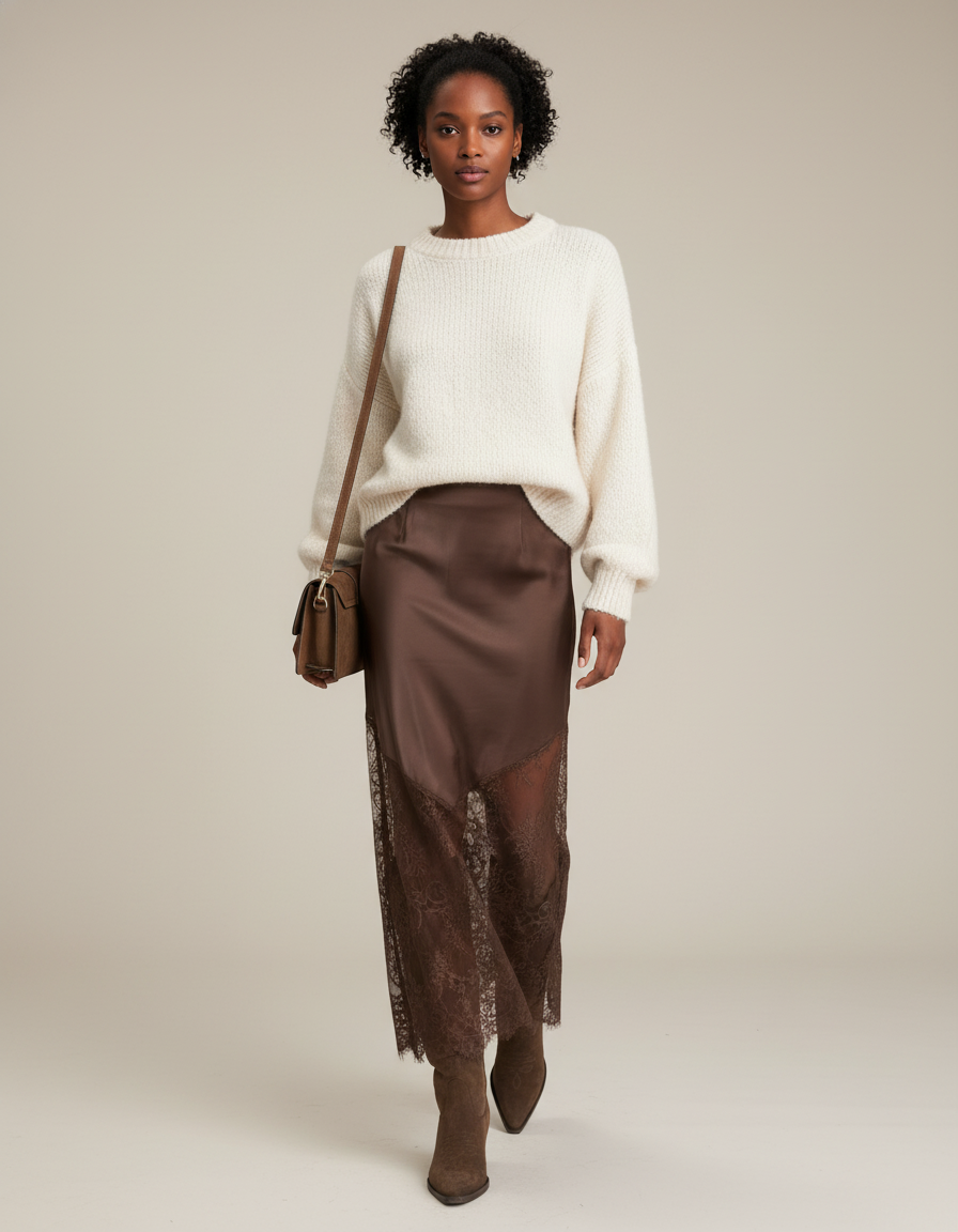 - Coupe : Jupe longue avec une partie supérieure unie et une partie inférieure en dentelle.
