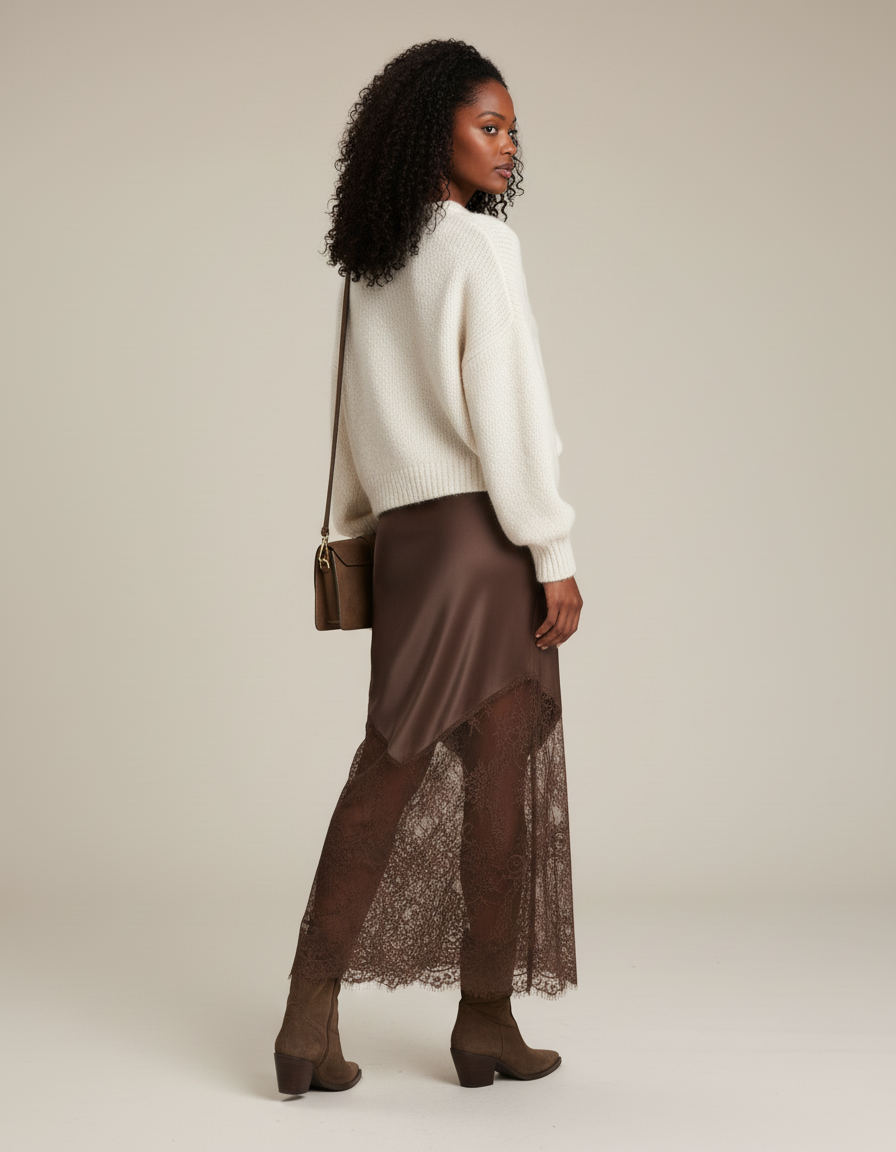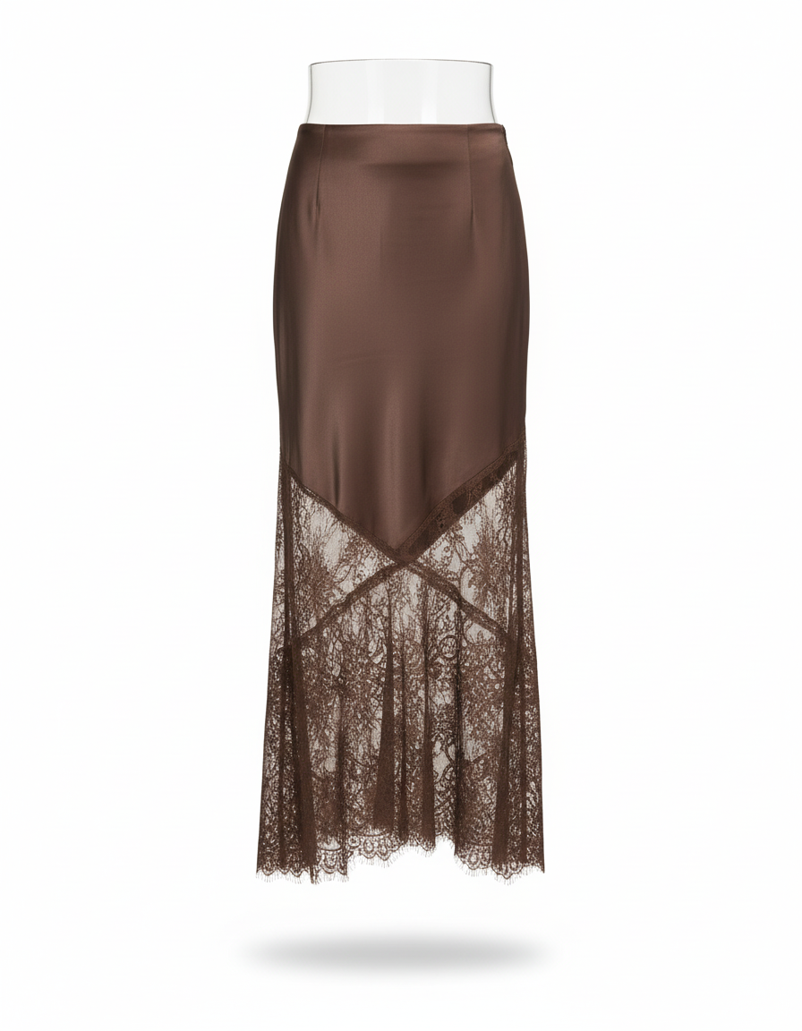 Découvrez la Jupe De Soirée Mi-Longue, une pièce maîtresse qui incarne l'élégance moderne avec une audace subtile. Confectionnée dans un satin fluide d'un marron profond, cette jupe offre un tombé impeccable et un éclat délicat à chaque mouvement. Son design asymétrique est magnifié par une dentelle exquise qui se dévoile avec grâce, ajoutant une touche de sensualité raffinée. C'est la jupe idéale pour celles qui recherchent une silhouette distinctive et un confort luxueux, capable de transformer n'importe quelle occasion en un moment d'exception.
