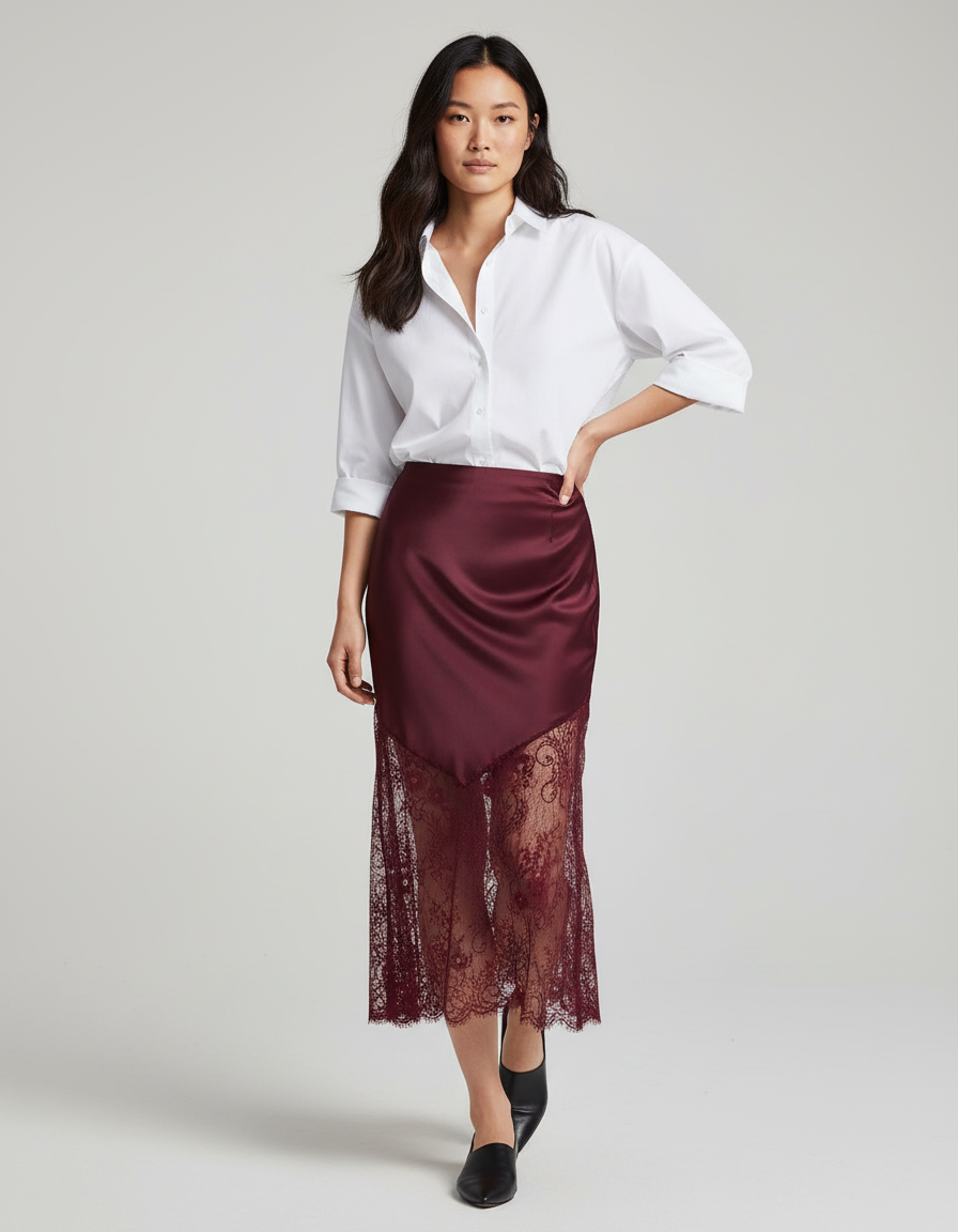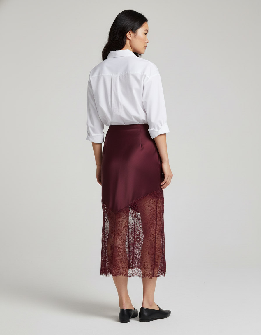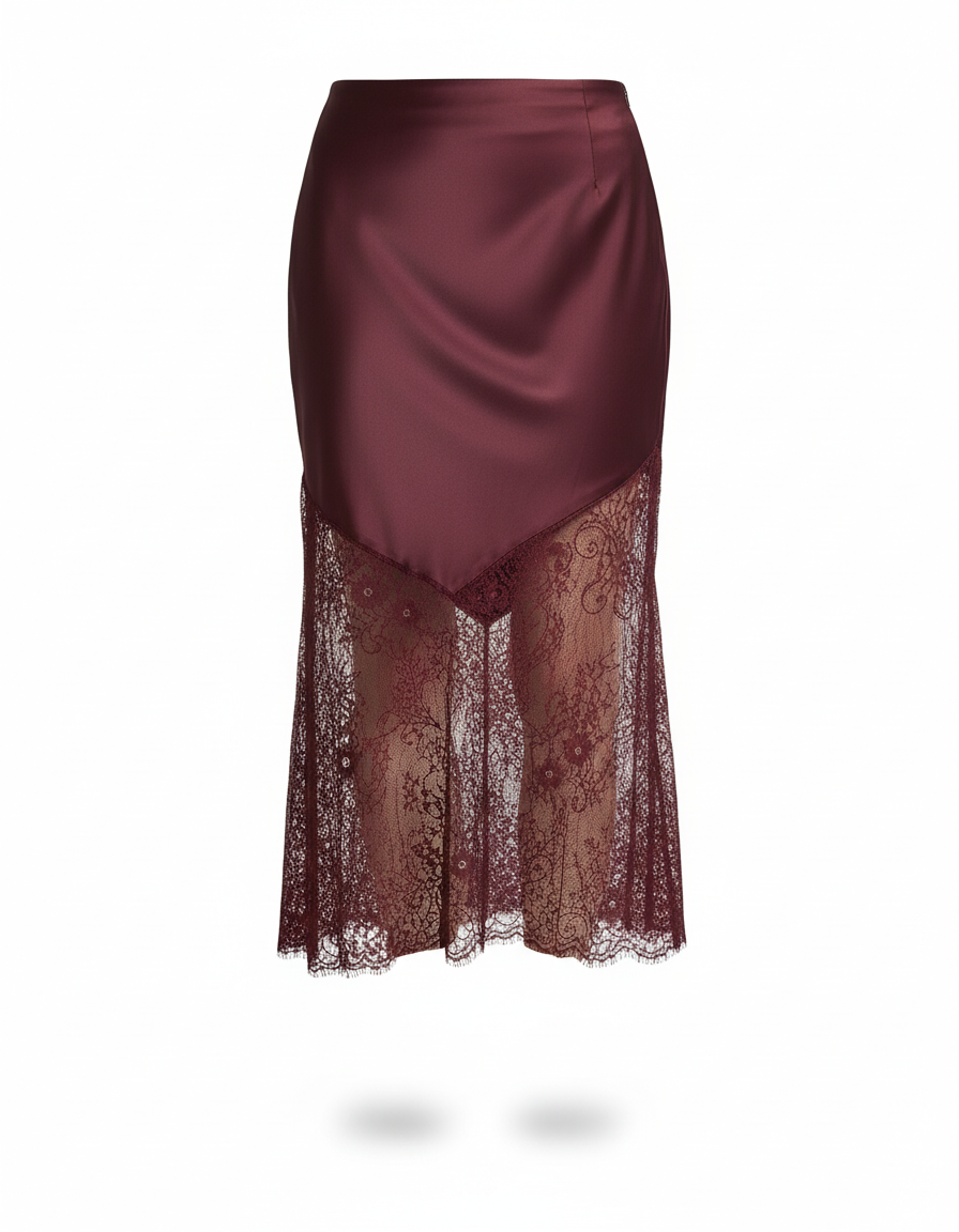 Son design asymétrique, mariage sublime entre la fluidité du satin bordeaux et la délicatesse d'une dentelle exquise, offre une silhouette unique et une profondeur visuelle remarquable. Chaque mouvement révèle un jeu subtil de textures et de transparence, transformant une simple jupe en une véritable déclaration de mode. Bien plus qu'un vêtement, elle est une œuvre d'art textile, promettant une allure raffinée et mémorable en toute occasion.
