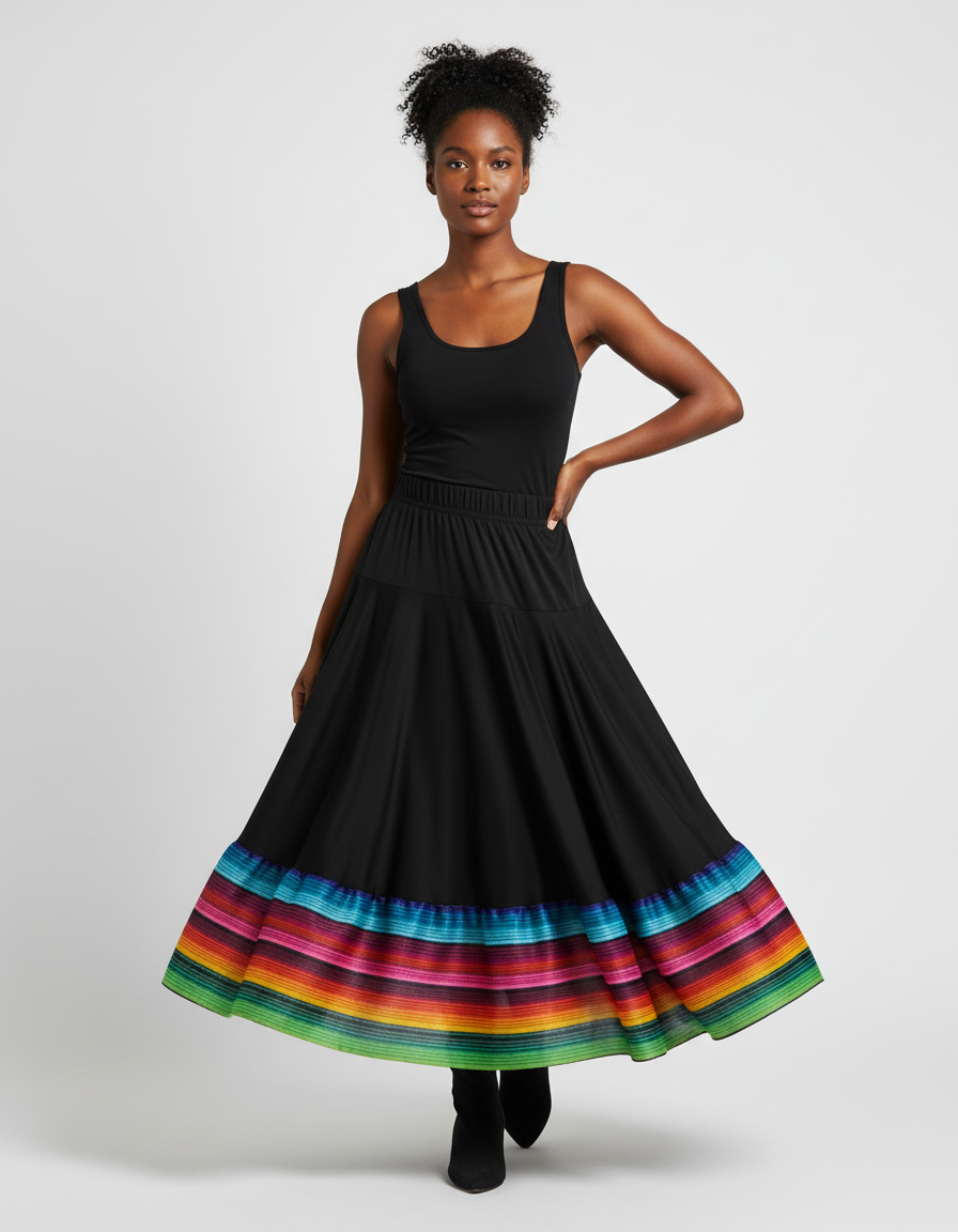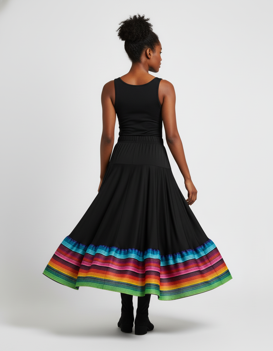 Cette jupe longue pour femme est confectionnée en polyester et spandex. Elle présente une taille haute et un ourlet large, avec un motif de rayures colorées au bas.