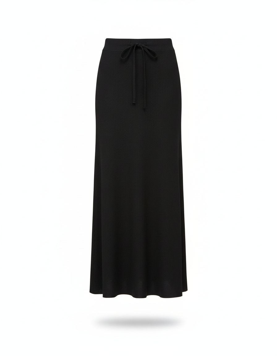 Ce qui distingue notre jupe, c'est sa matière en maille côtelée de haute qualité, sélectionnée pour sa douceur exceptionnelle et son tombé impeccable, garantissant une liberté de mouvement incomparable. La couleur noire intense en fait un classique indémodable, facile à associer avec n'importe quel haut, du pull en cachemire au chemisier en soie. Le détail de la taille ajustable par cordon ajoute une touche contemporaine et un confort personnalisé, faisant de cette jupe un investissement durable dans votre style. Une pièce essentielle qui incarne le luxe discret et la fonctionnalité au quotidien.