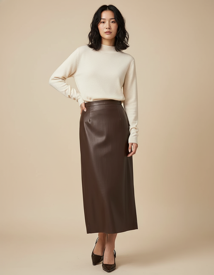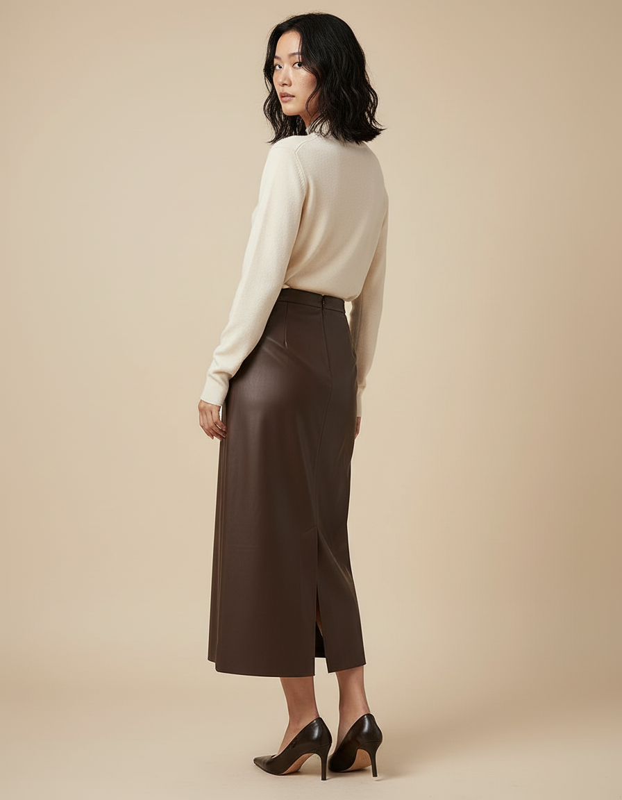 Adoptez la sophistication intemporelle de notre jupe crayon en cuir marron, la pièce maîtresse idéale pour affronter l'hiver avec style. Sa coupe longue et moulante, au tombé impeccable, sublime votre silhouette avec une élégance naturelle. Associez-la à un pull en cachemire crème pour un look de bureau raffiné et confortable, comme illustré. Pour une soirée, osez un chemisier en soie et des talons aiguilles, transformant instantanément votre tenue en une déclaration chic. Sa couleur marron riche offre une polyvalence surprenante, se mariant aisément avec des teintes neutres ou des touches de couleurs vives.
