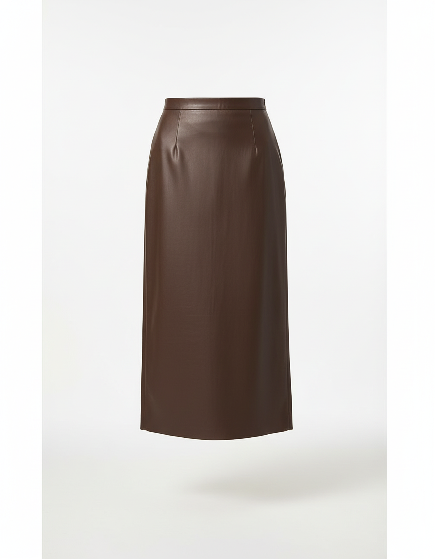 Cette jupe longue est une Jupe En Cuir Longue Crayon de couleur marron. Elle présente une coupe droite et une longueur variant entre 90 et 92 cm selon la taille.