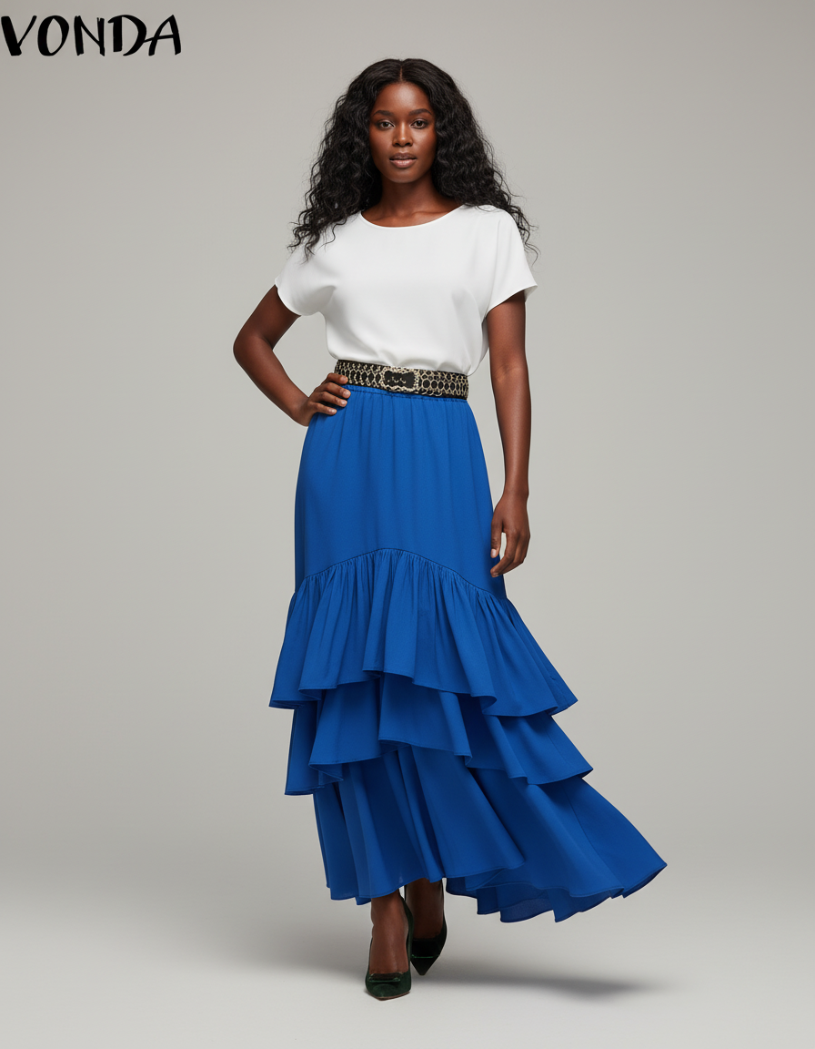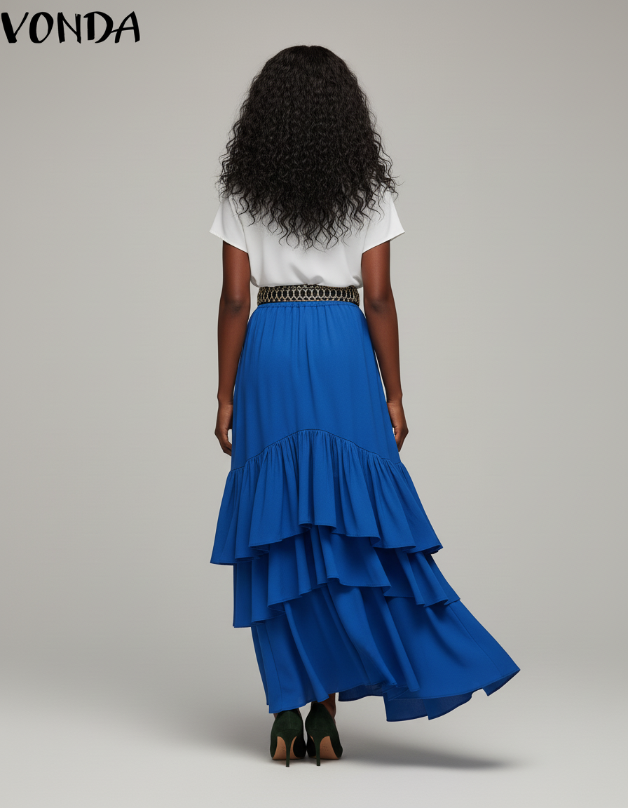 Cette jupe présente une coupe longue avec des volants superposés sur la partie inférieure. La couleur est unie.