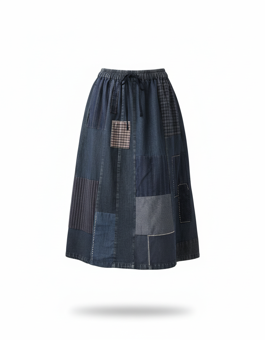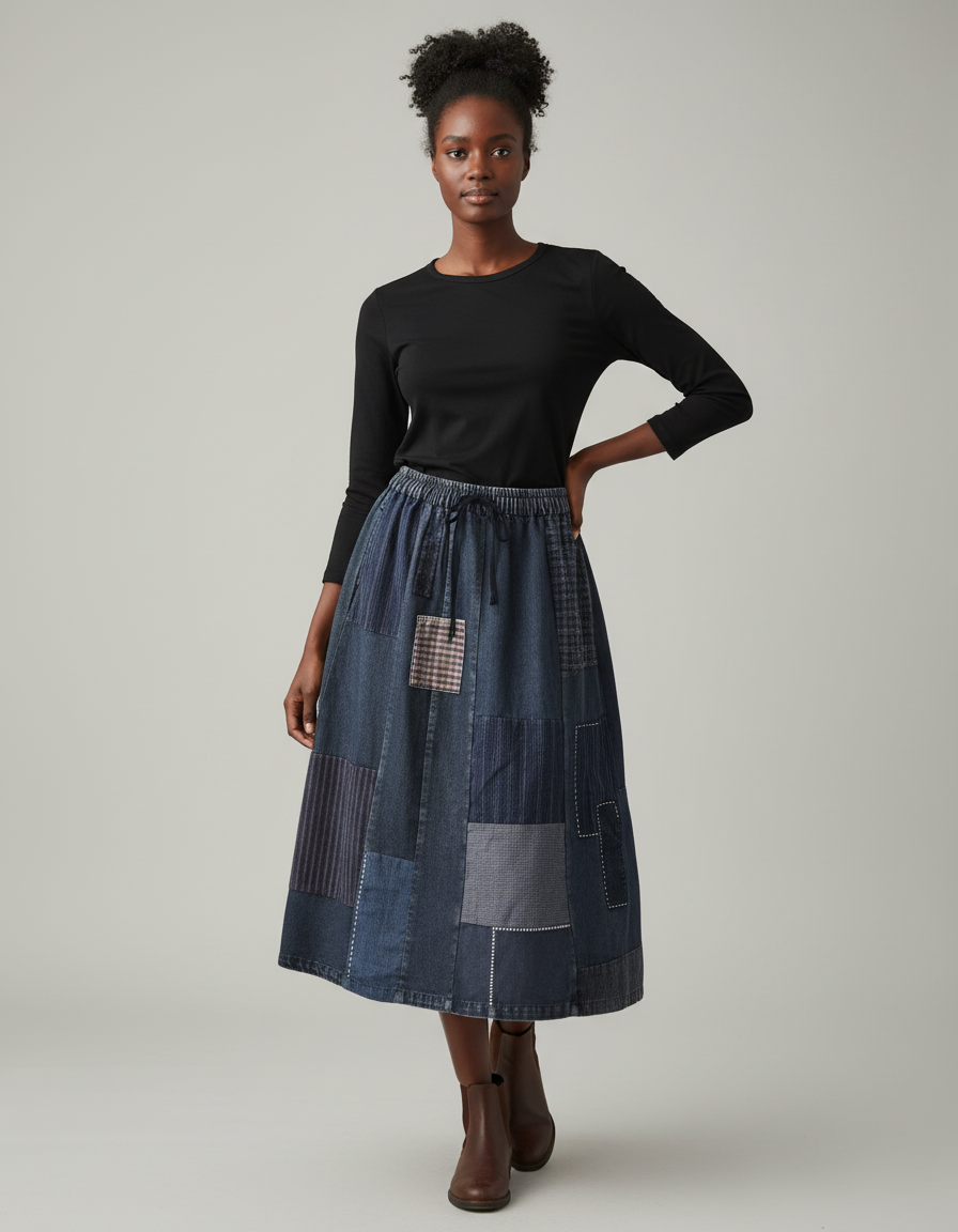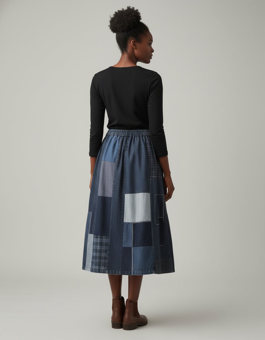 Cette jupe est un modèle long de type jean, présentant une confection en patchwork. Elle est équipée d'une taille élastique pour un ajustement.