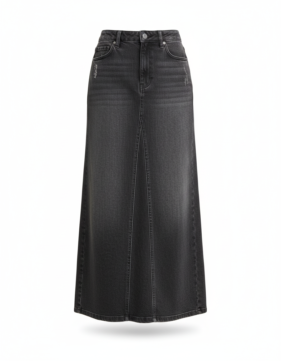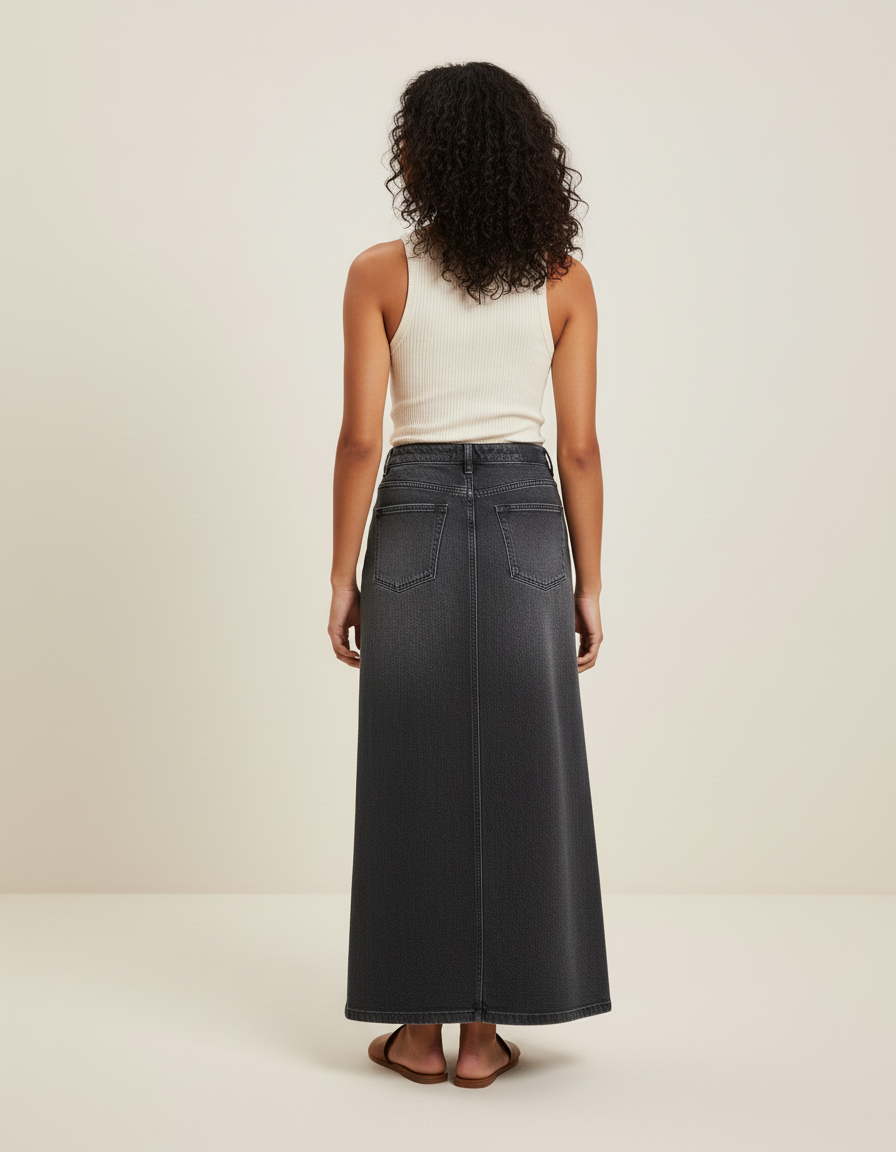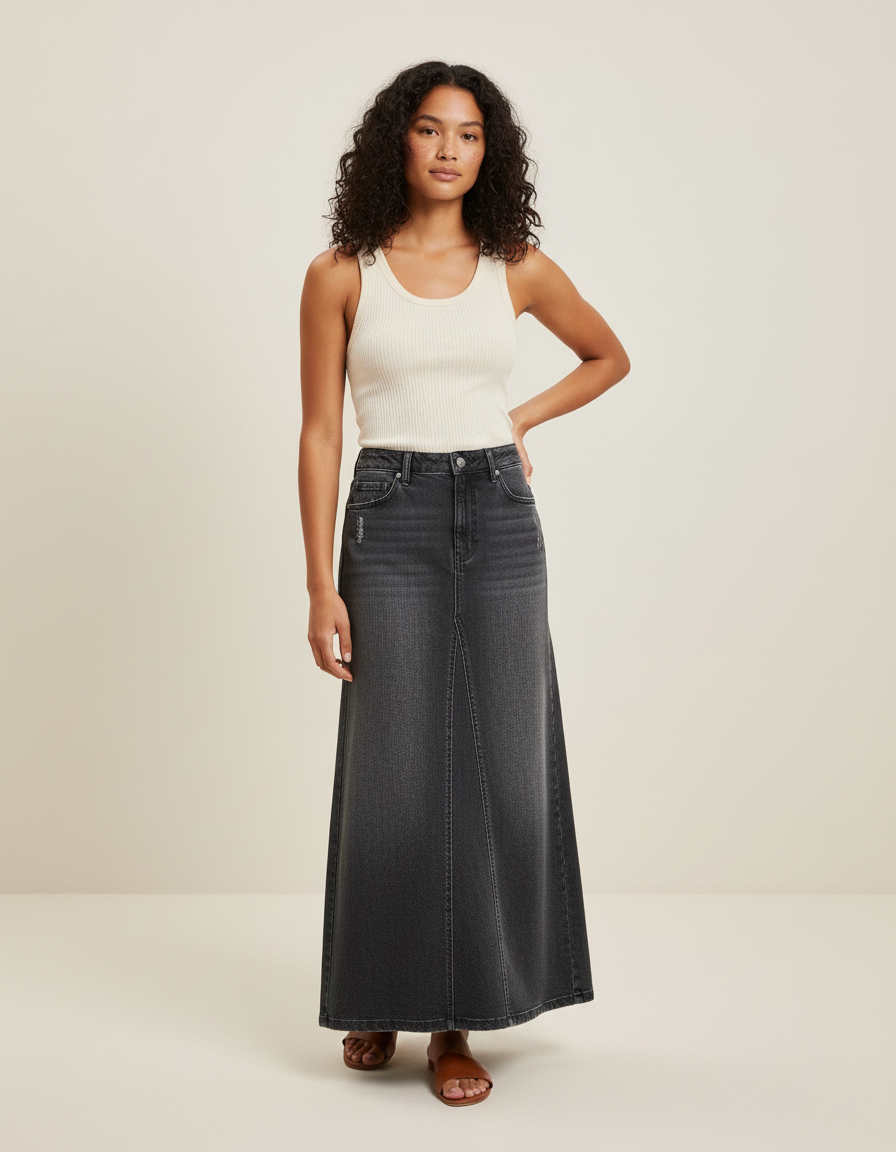 Adoptez un style décontracté et chic avec notre jupe en jean longue grise, parfaite pour toutes les occasions.