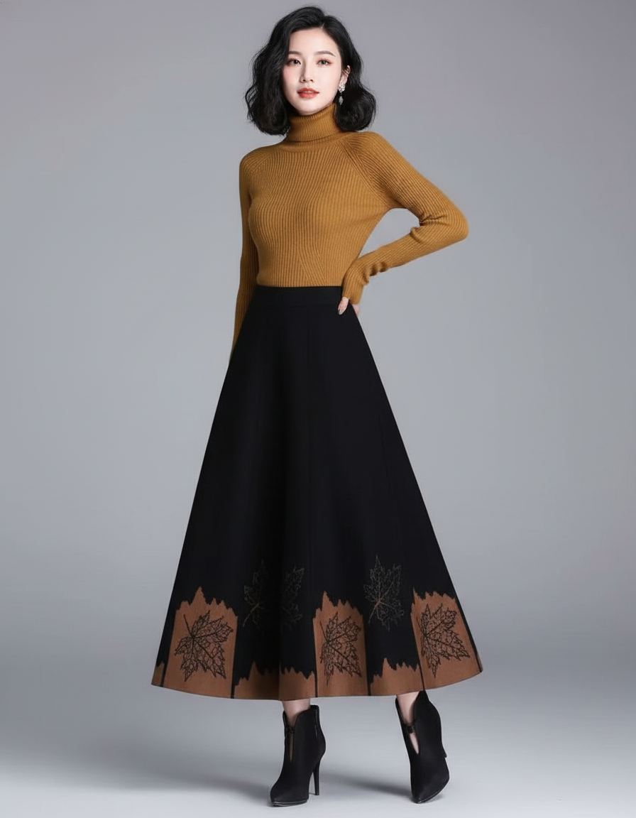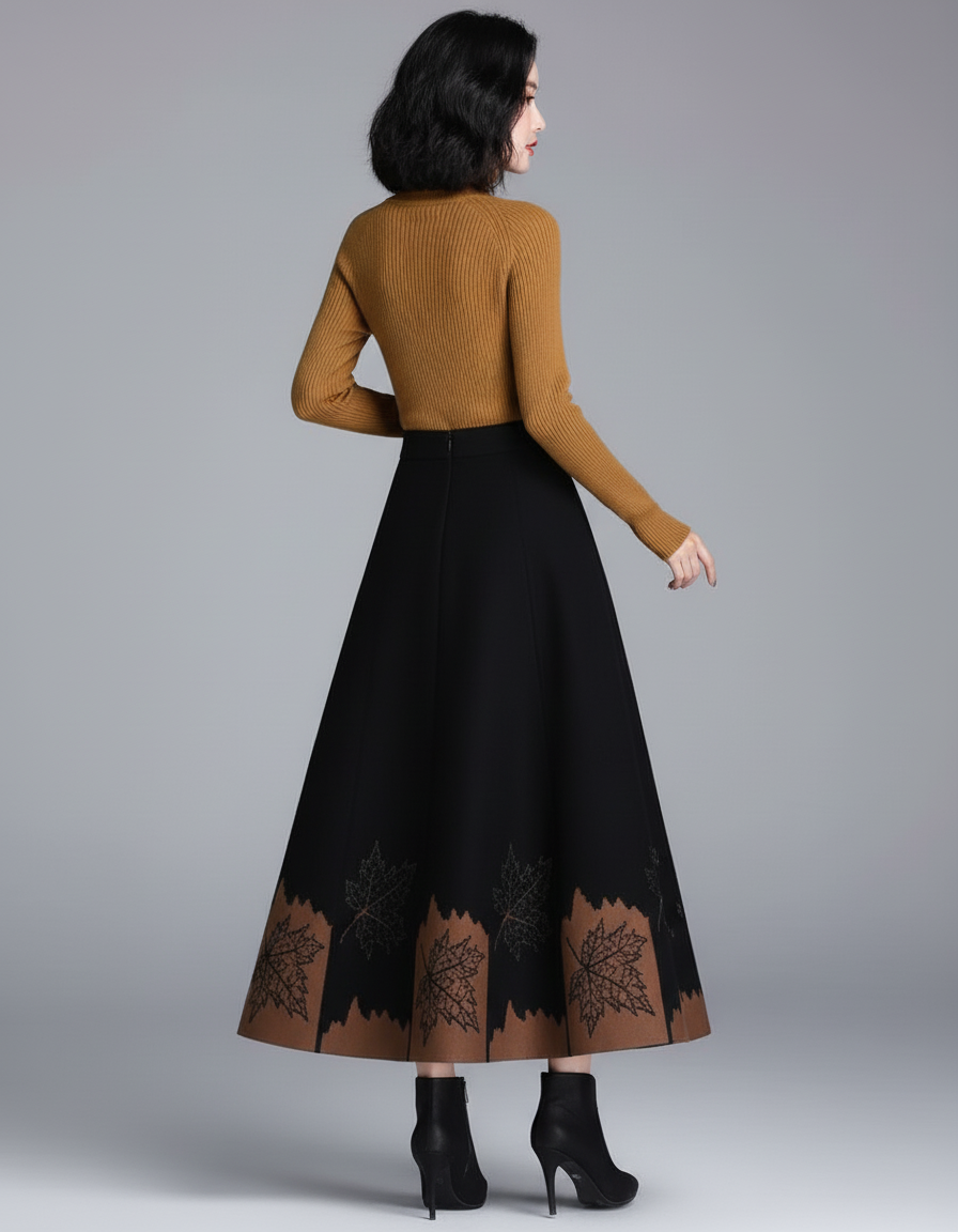 Notre Jupe En Laine Mi-Longue, au style trapèze fluide, est la pièce maîtresse pour une élégance hivernale sans effort. Son design unique, agrémenté de délicats motifs de feuilles d'érable sur un ourlet contrastant, apporte une touche de raffinement et d'originalité. Pour une journée au bureau, associez-la à un pull col roulé ajusté et des bottines chic, comme le modèle le suggère. Pour une sortie plus habillée, un chemisier en soie et des escarpins transformeront instantanément votre allure en une silhouette sophistiquée et mémorable. C'est la toile de fond parfaite pour exprimer votre style personnel avec distinction.