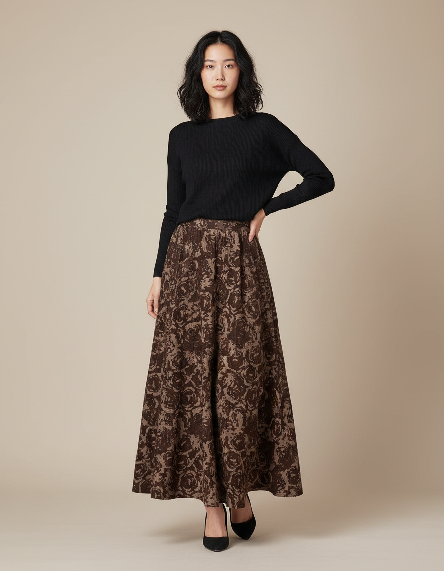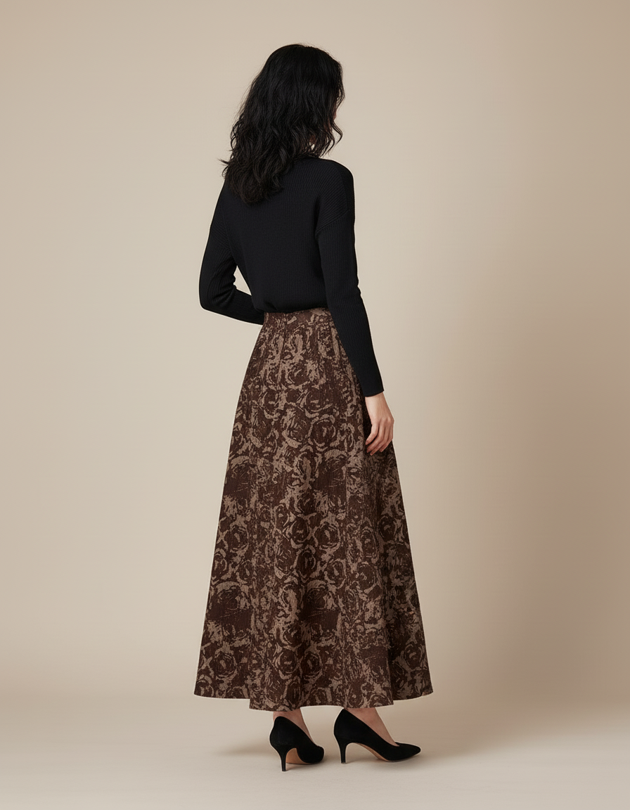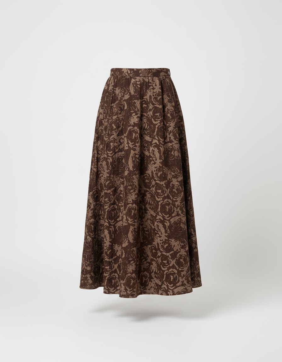 Cette jupe est un vêtement long de coupe évasée. Elle présente un motif floral dans des tons marron et beige.