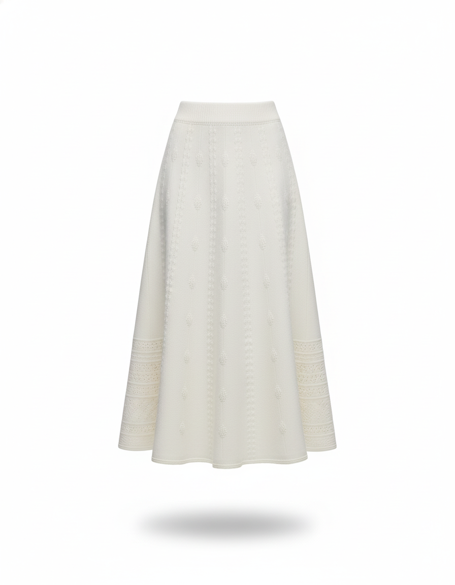 Cette jupe présente une coupe évasée, une taille haute et une longueur mi-longue. Elle est de couleur écru et possède un motif texturé discret.