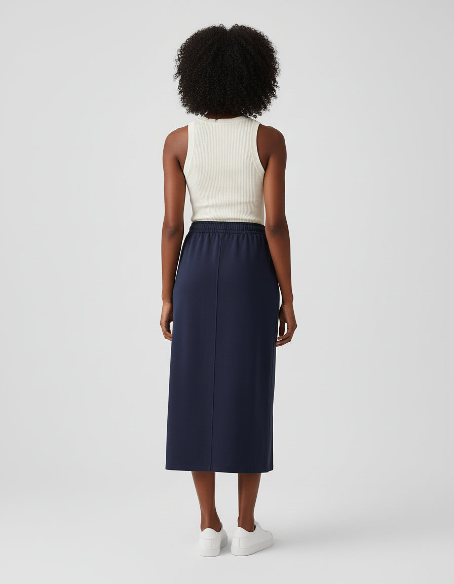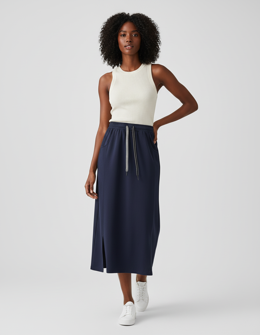 Cette jupe mi-longue allie confort et style décontracté pour un look moderne au quotidien.