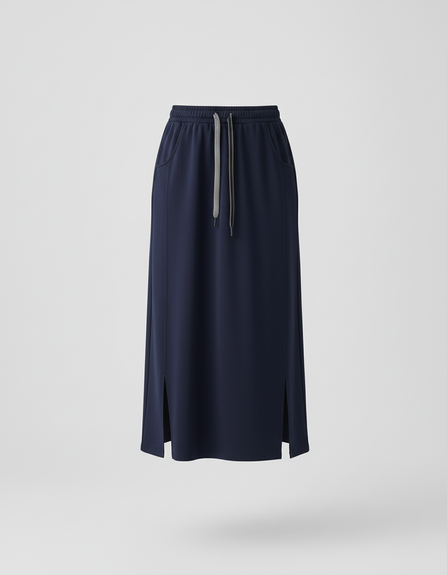 Conçue pour votre bien-être, cette jupe offre un confort exceptionnel grâce à sa maille douce et respirante. La fente latérale discrète n'est pas qu'un détail esthétique ; elle garantit une liberté de mouvement totale, vous permettant de vaquer à vos occupations avec aisance et style. Son tombé fluide et impeccable épouse subtilement la silhouette sans jamais la contraindre, assurant une allure sophistiquée et une sensation de légèreté tout au long de la journée. Le cordon de serrage ajustable ajoute une touche moderne et fonctionnelle.