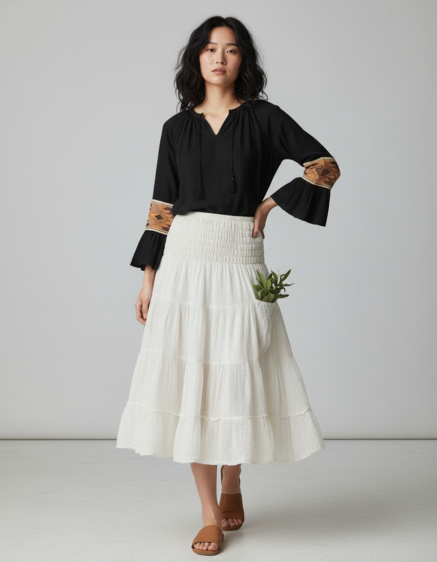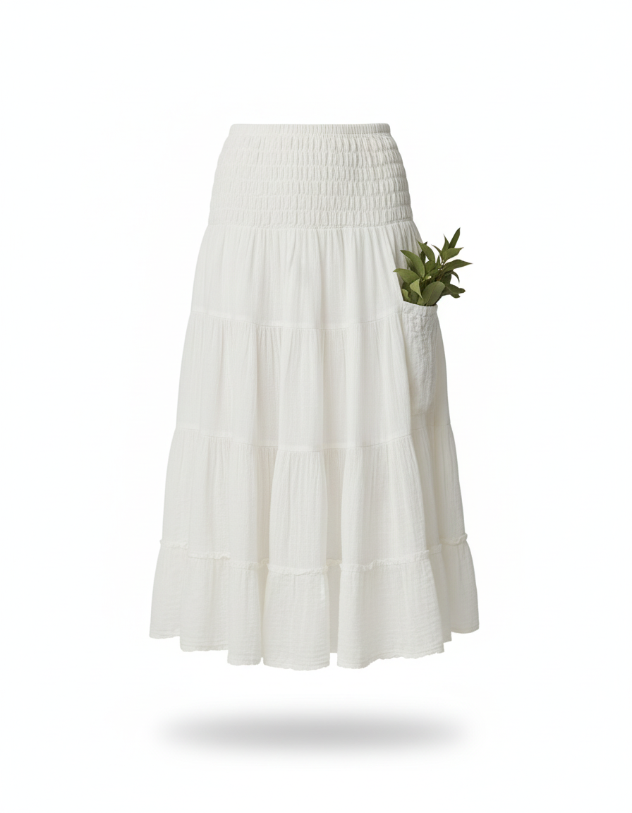 Adoptez l'allure insouciante et sophistiquée avec notre Jupe Gitane Mi-Longue. Confectionnée en pur coton blanc, sa taille élastique froncée garantit un confort absolu et une liberté de mouvement inégalée, épousant délicatement votre silhouette sans jamais la contraindre. Son tombé fluide et ses volants superposés créent une silhouette aérienne et romantique, parfaite pour les journées ensoleillées comme les soirées douces. Chaque détail est pensé pour votre bien-être et une élégance naturelle qui vous accompagnera en toute occasion.