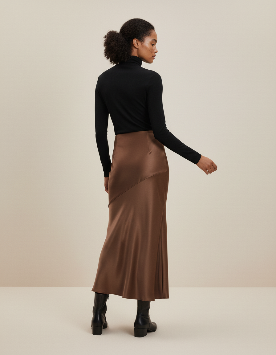Découvrez la Jupe Godet Longue, une pièce maîtresse qui incarne la sophistication moderne. Confectionnée dans un satin fluide d'un marron riche et profond, elle glisse avec une légèreté incomparable, épousant subtilement votre silhouette avant de s'évaser en un mouvement gracieux. Son tombé impeccable et son éclat délicat captent la lumière à chaque pas, vous enveloppant d'une aura d'élégance naturelle. C'est la promesse d'un confort absolu allié à un style audacieux, vous permettant de vous sentir confiante et sublimée, sans effort.
