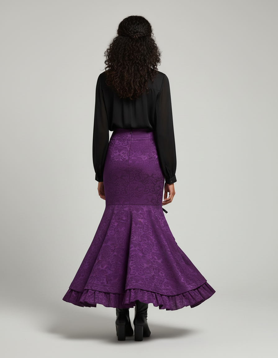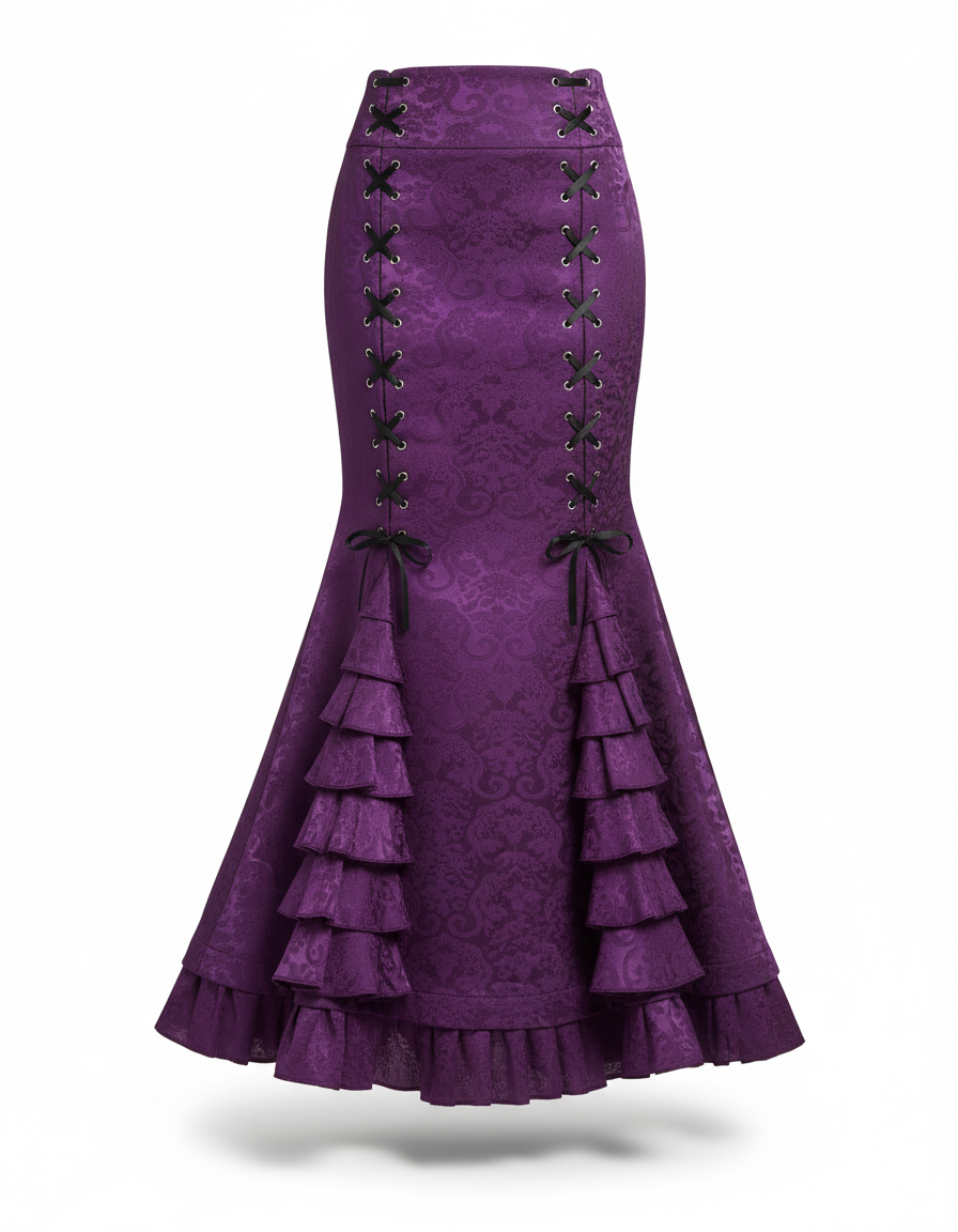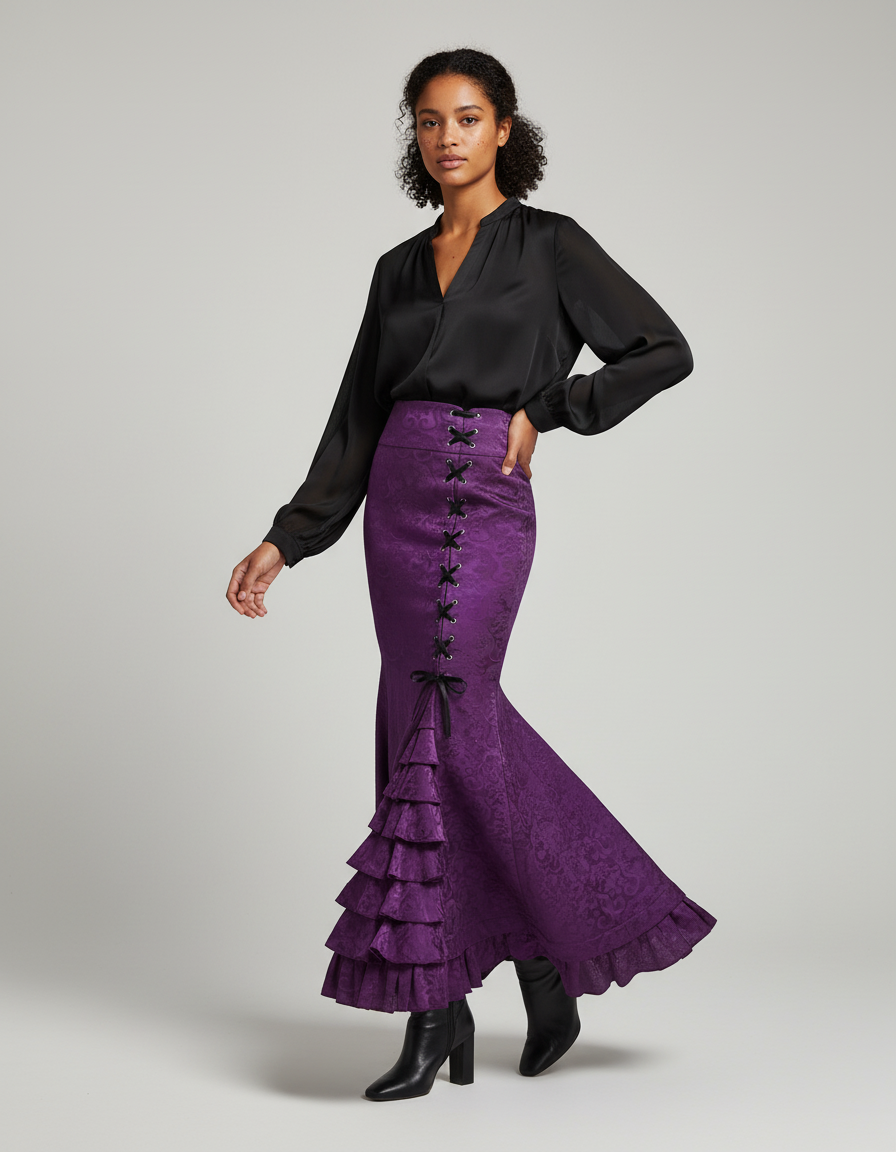 Affirmez votre style avec notre Jupe Gothique Longue, une pièce maîtresse en satin violet somptueux. Sa coupe moulante, sublimée par des lacets audacieux le long de la cuisse et des volants délicats, crée une silhouette spectaculaire. Idéale pour les soirées mémorables, les cocktails chics ou tout événement où vous souhaitez captiver l'attention. Associez-la à un chemisier en soie noire fluide pour une allure mystérieuse et sophistiquée, ou osez un top plus ajusté pour accentuer son caractère. C'est la garantie d'une entrée remarquée, pour une élégance qui ne laisse personne indifférent.