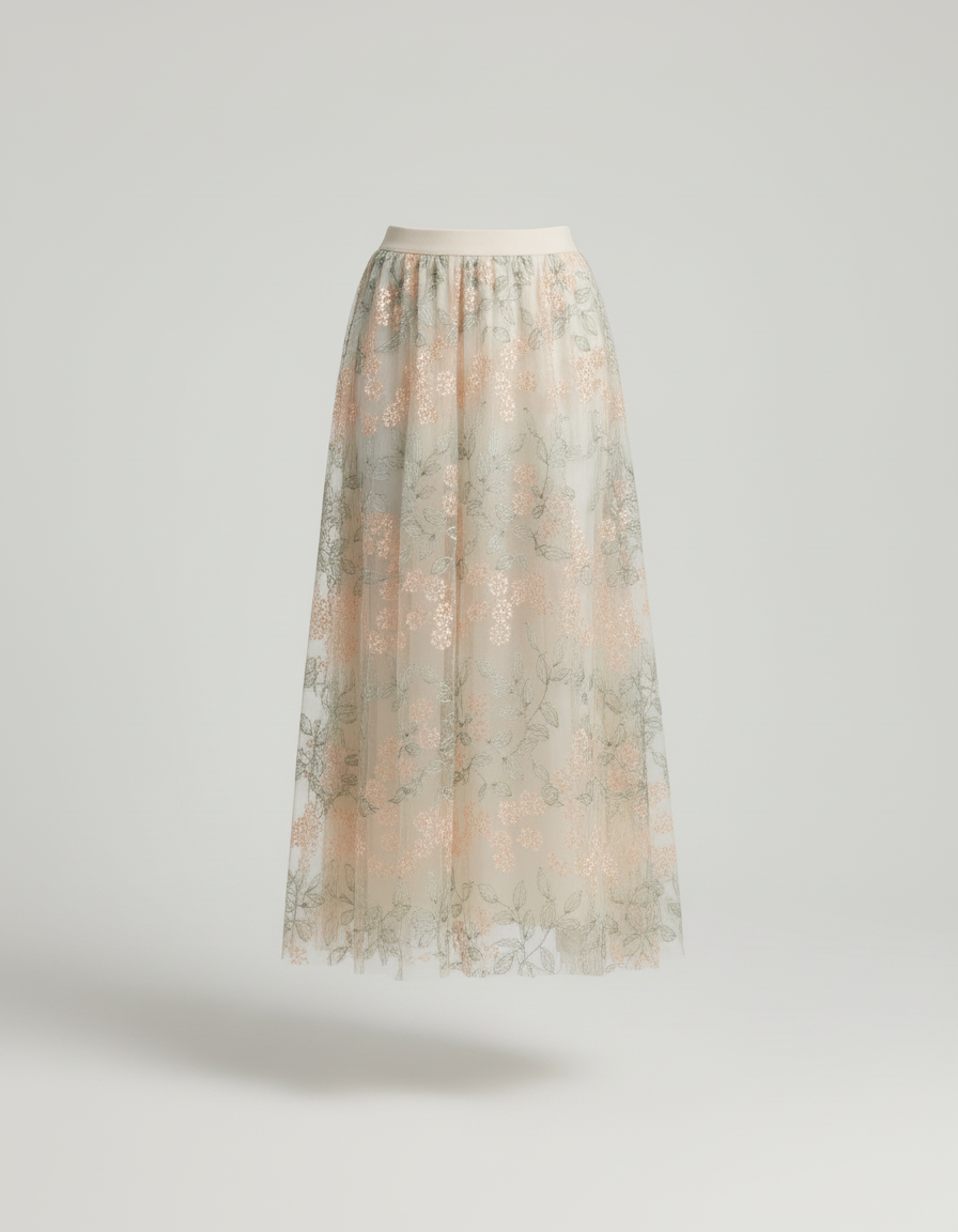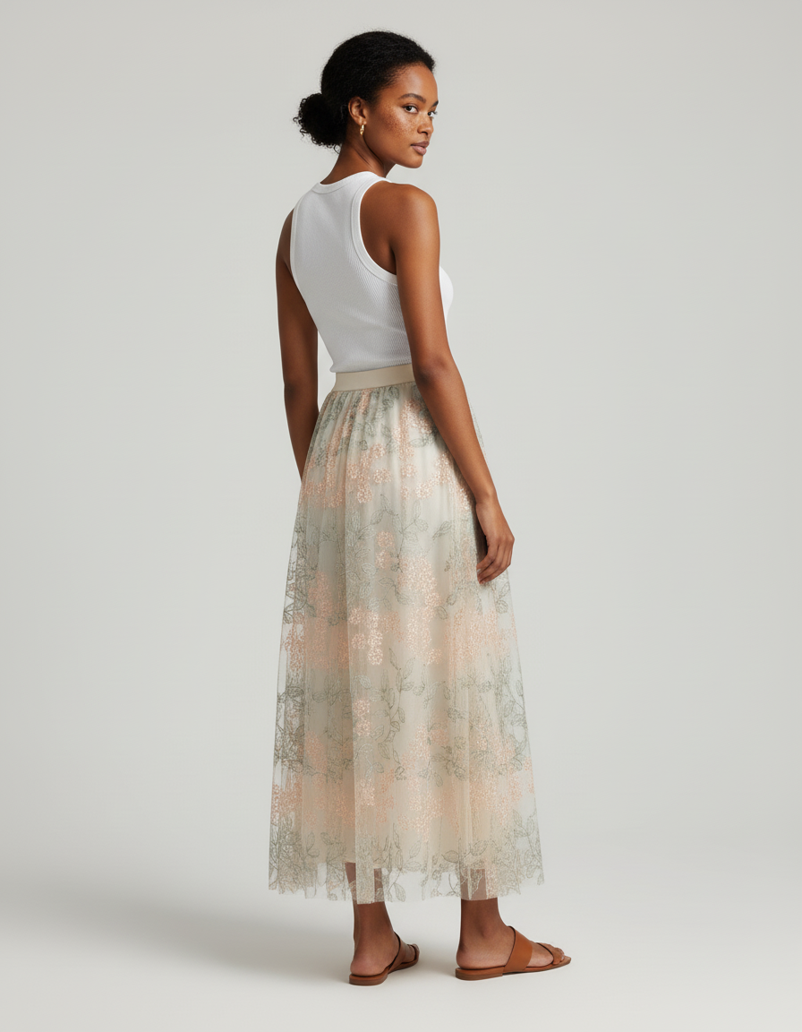 Ce qui distingue véritablement cette jupe, c'est son tulle brodé de motifs floraux colorés aux nuances subtiles de pêche et de vert sauge, créant un effet visuel d'une richesse inégalée. Loin des créations éphémères, la Jupe Hippie Longue est une invitation à affirmer votre style avec une sophistication naturelle. Portez-la avec un simple débardeur pour une allure décontractée chic ou avec une blouse soyeuse pour une occasion spéciale, elle est le symbole d'une élégance affirmée et sans effort.