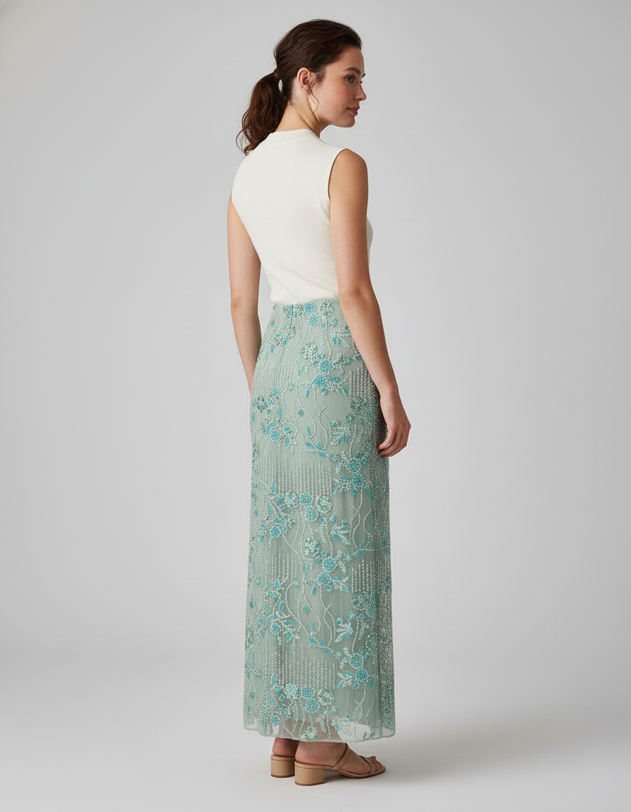 Ce qui la distingue, c'est son tulle délicat entièrement brodé de sequins scintillants et de perles, formant des motifs floraux aqua qui contrastent élégamment sur le fond vert sauge. Chaque détail reflète un savoir-faire d'exception, transformant cette jupe en une œuvre d'art portable. La coupe droite et fluide, associée à sa texture riche, assure un confort absolu tout en projetant une image de luxe moderne et accessible. Osez l'originalité et la sophistication avec une pièce qui célèbre votre singularité.