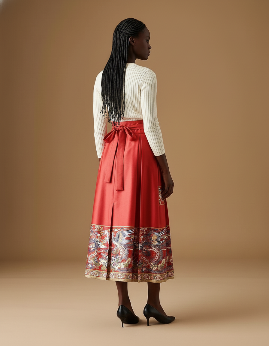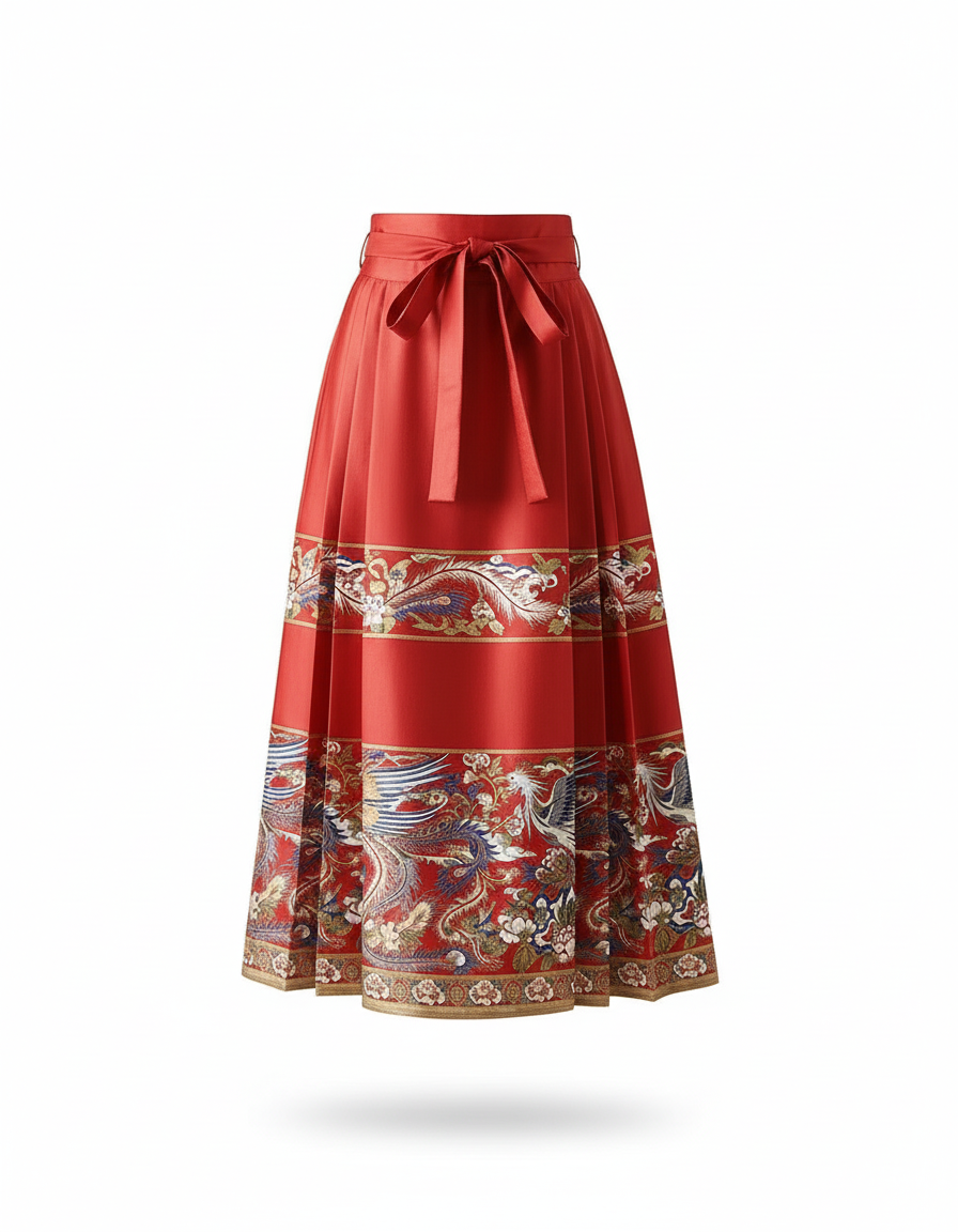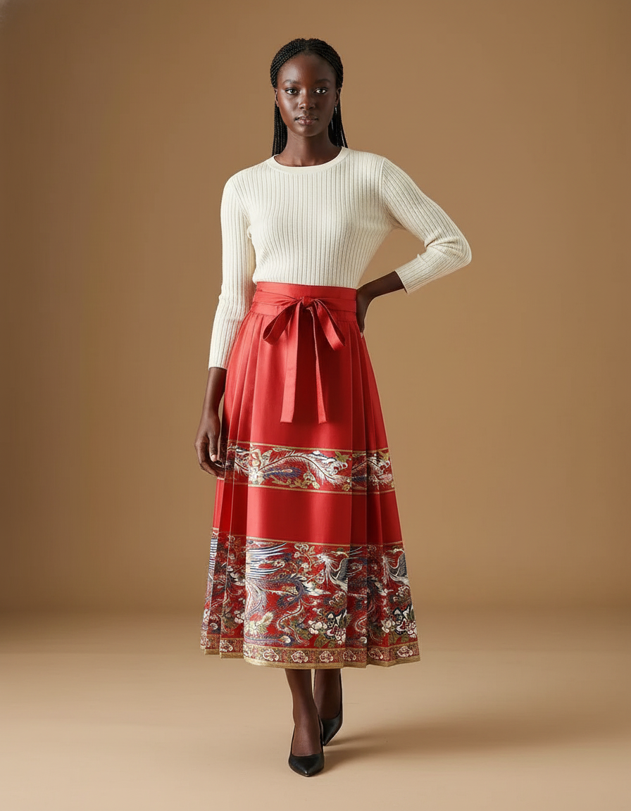 Cette jupe longue de couleur rouge présente une coupe évasée et une taille haute. Elle est munie d'une ceinture à nouer et d'une bande de motifs détaillés près de l'ourlet.