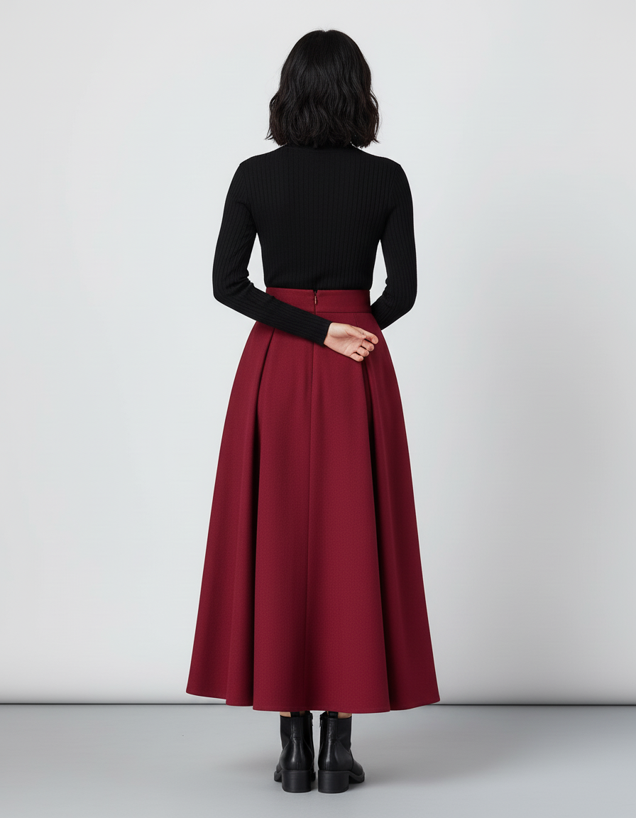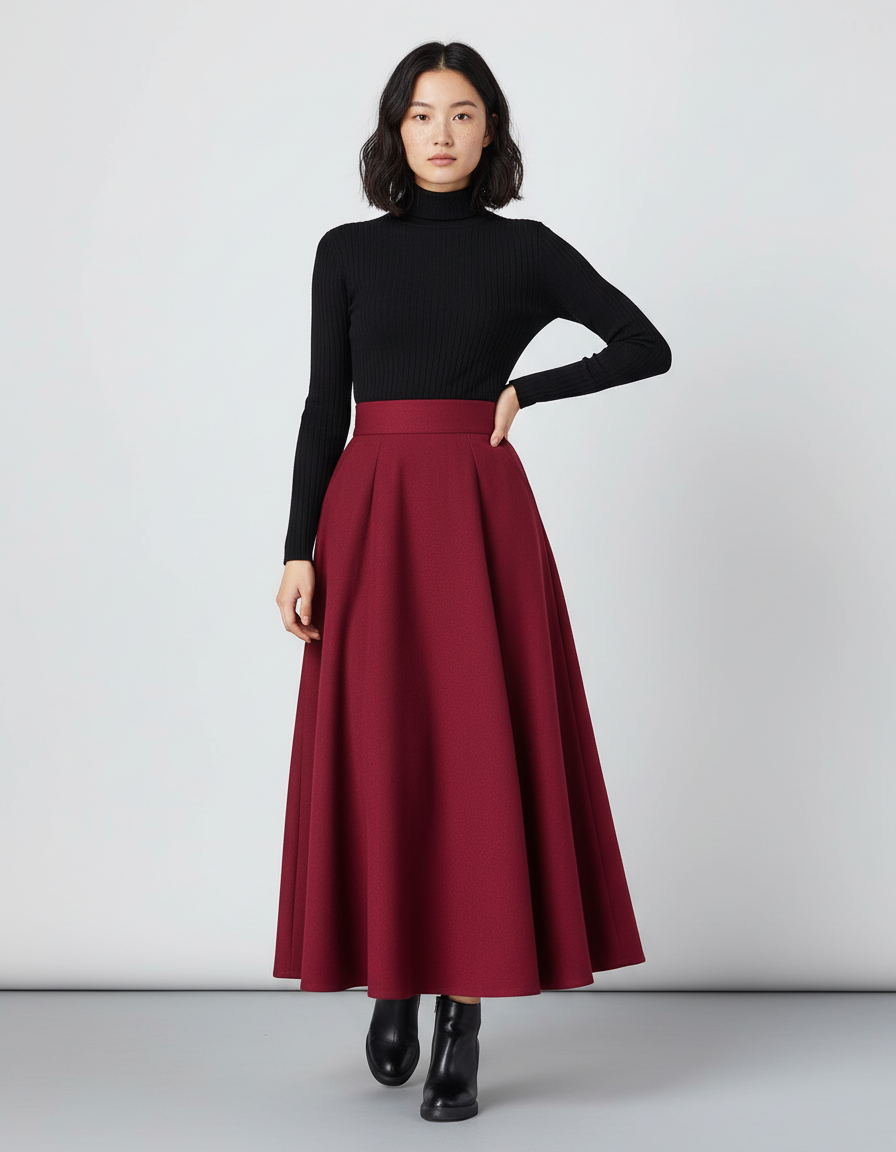 La Jupe Longue Année 50 en laine bordeaux est une pièce maîtresse de votre garde-robe hivernale, offrant une polyvalence inégalée. Pour une allure sophistiquée au bureau, associez-la à un pull col roulé en maille fine et des bottines élégantes, comme le modèle présenté, pour un ensemble chic et professionnel. En soirée, transformez votre look avec une blouse en soie fluide et des talons pour une touche glamour et festive. Pour vos escapades du week-end, mariez-la à un pull douillet et des bottes plates pour un confort chic et décontracté, toujours avec élégance.