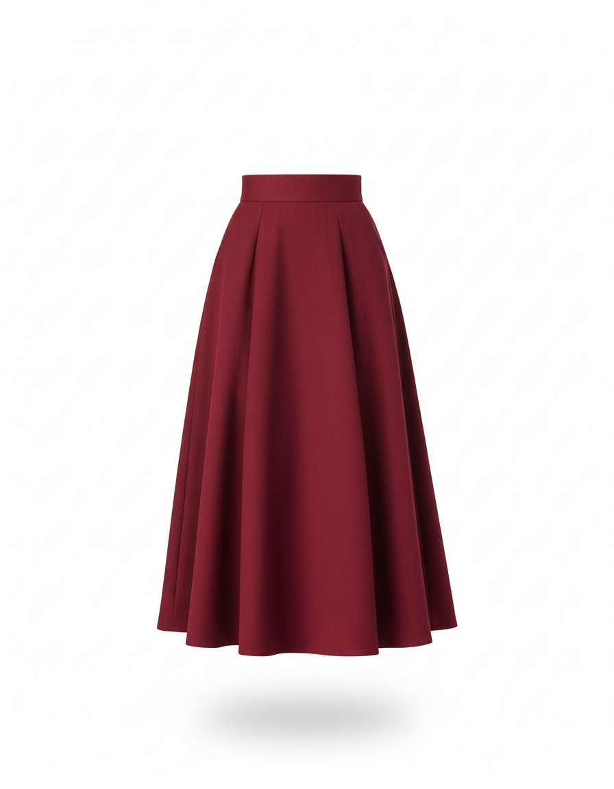 Cette jupe longue présente une coupe ample et une couleur unie bordeaux. Sa longueur varie entre 85 cm et 90 cm selon la taille choisie.