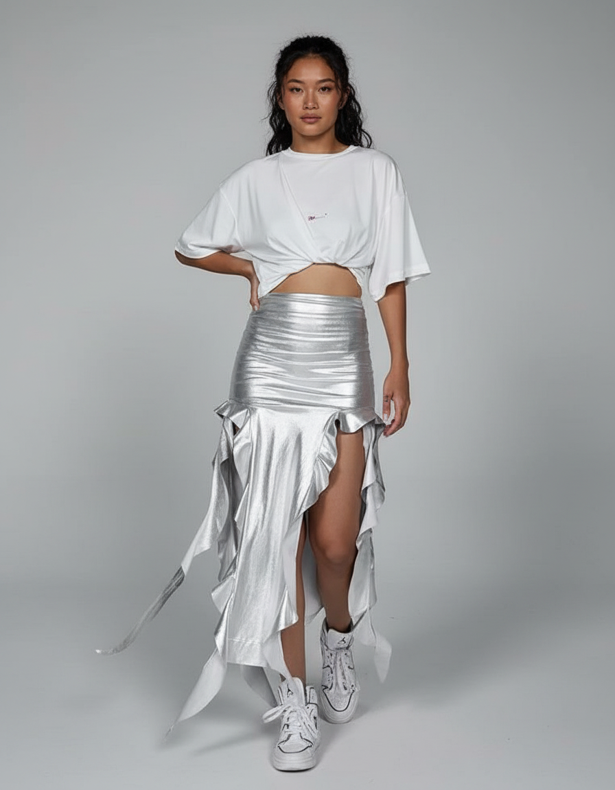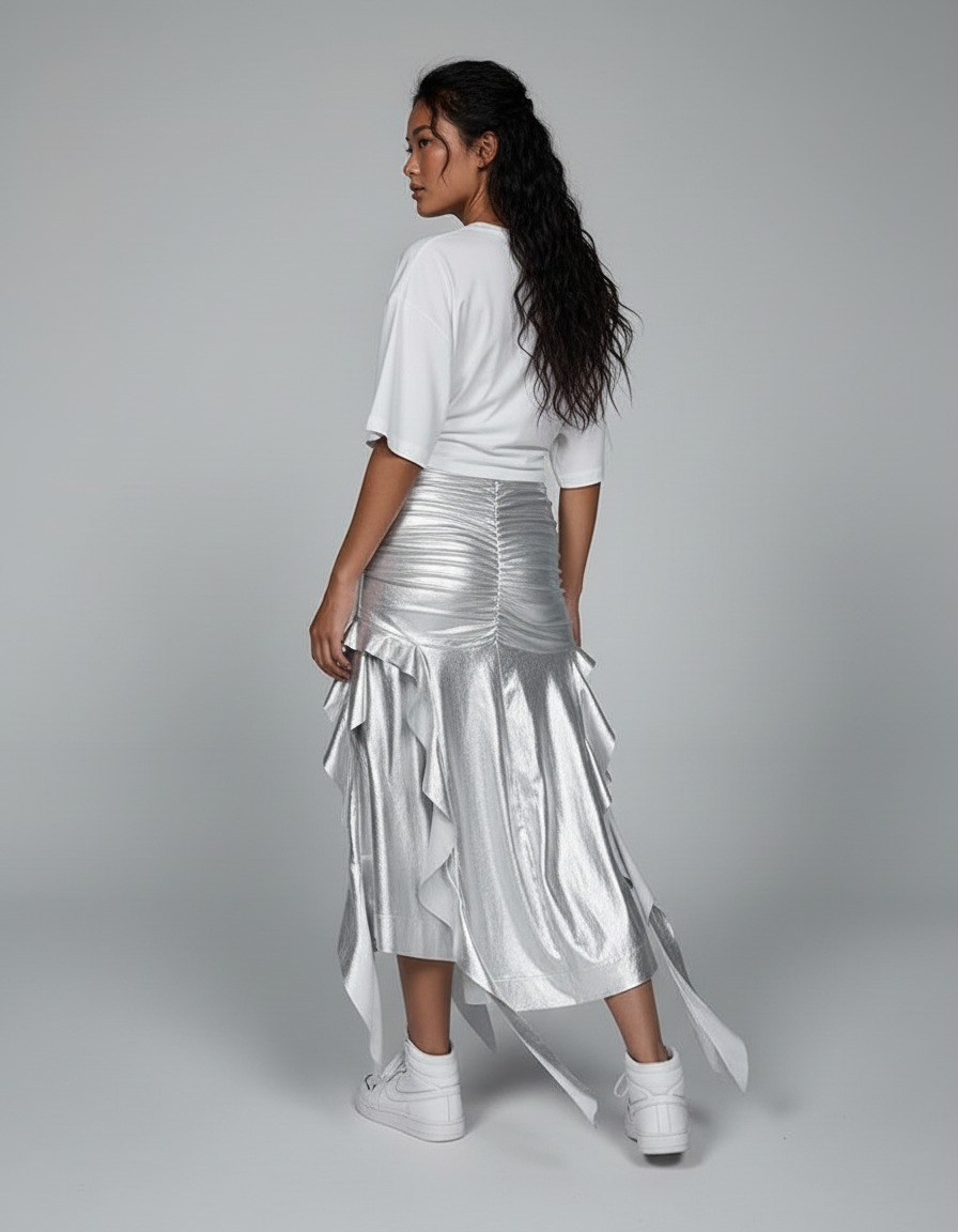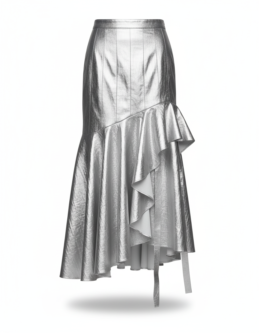 Cette pièce se distingue par son design asymétrique fluide et ses volants délicatement structurés qui créent un mouvement aérien et captivant. Confectionnée dans un tissu métallisé haut de gamme, elle sculpte la silhouette tout en garantissant un confort absolu. Sa fente audacieuse révèle avec subtilité la jambe, ajoutant une touche de glamour sans effort. C'est la signature parfaite pour un événement d'exception ou pour infuser une dose de luxe contemporain à votre vestiaire, s'associant avec aisance à des talons vertigineux ou à des sneakers stylées.