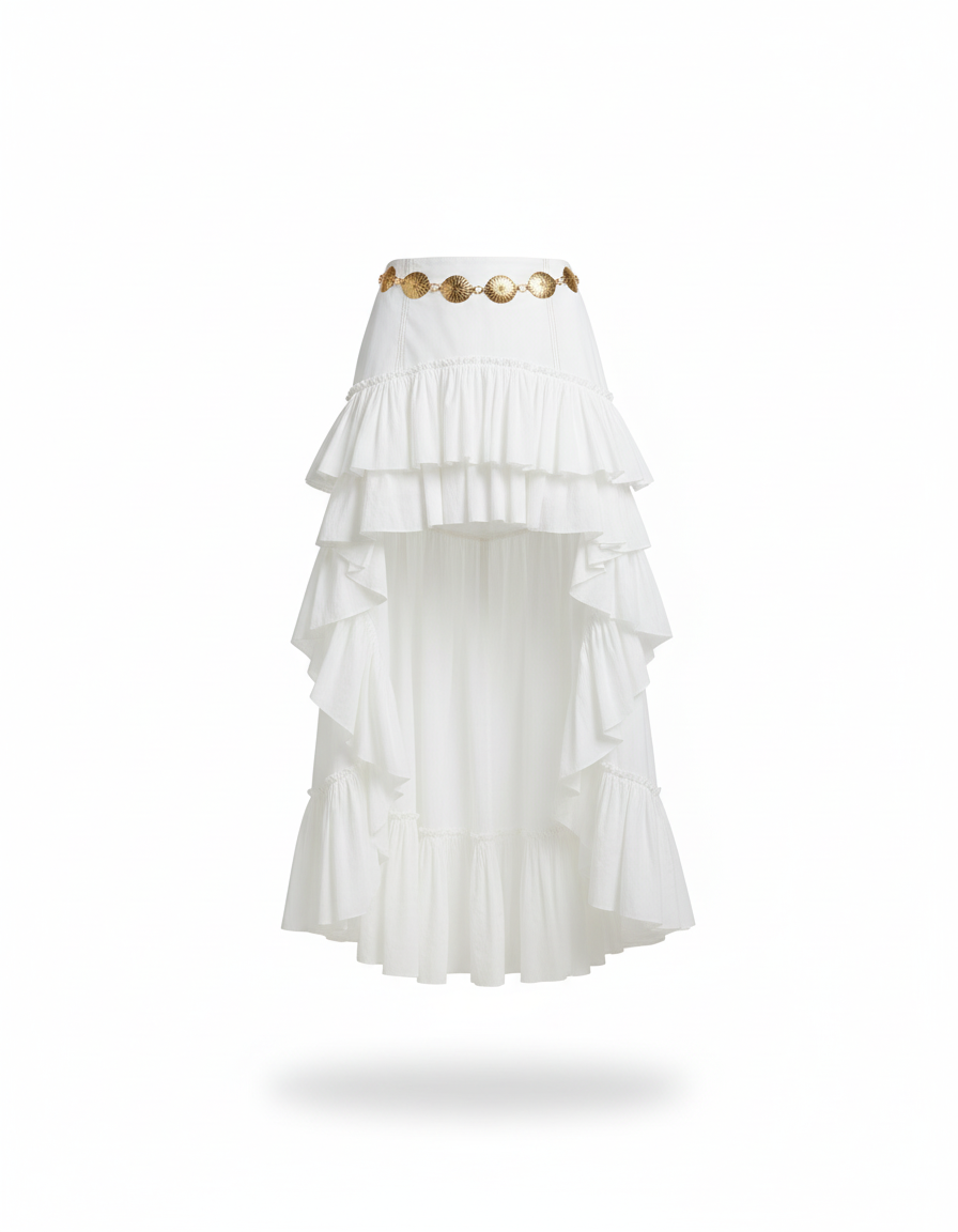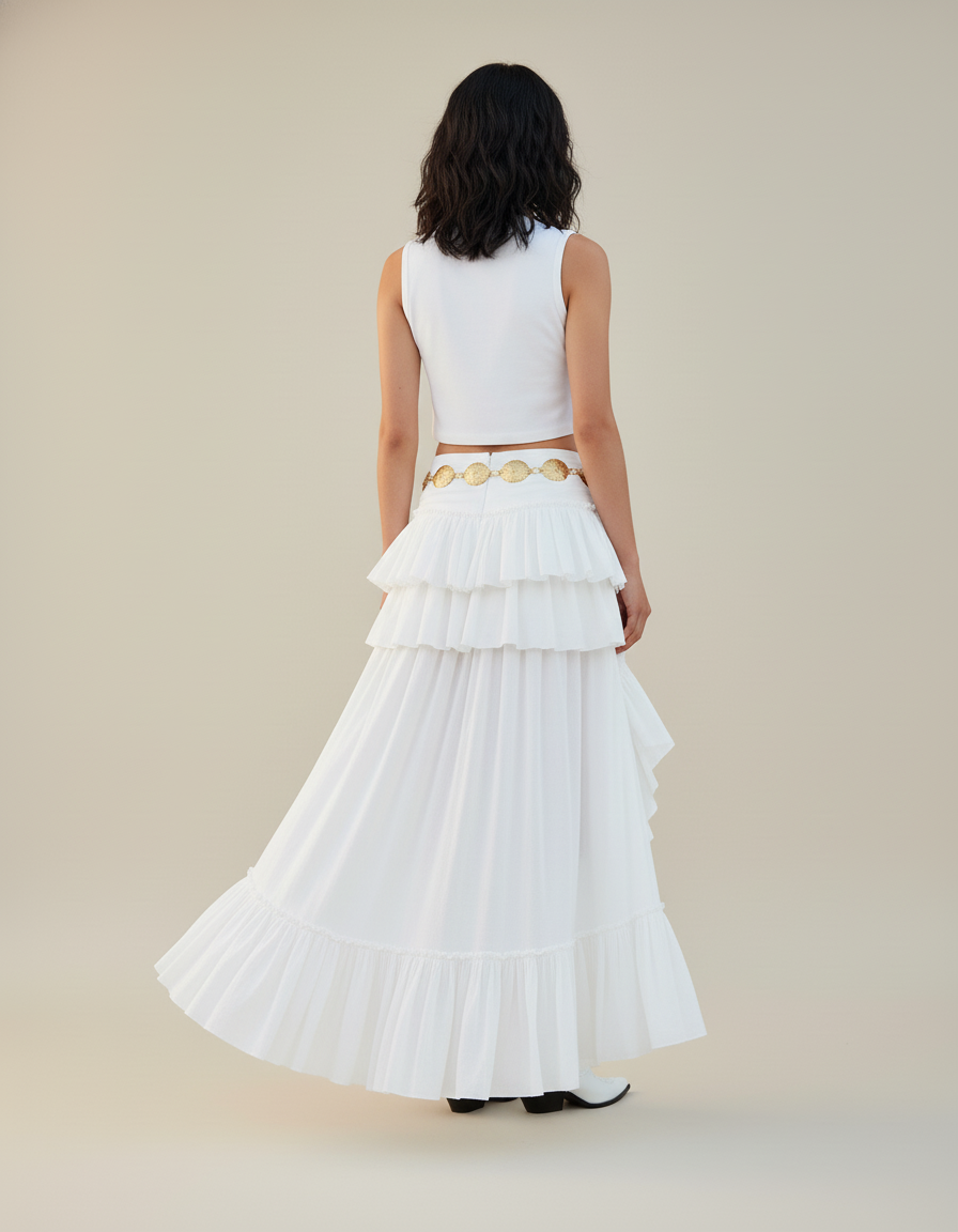 Jupe Longue Asymetrique Blanche à Volants Irréguliers