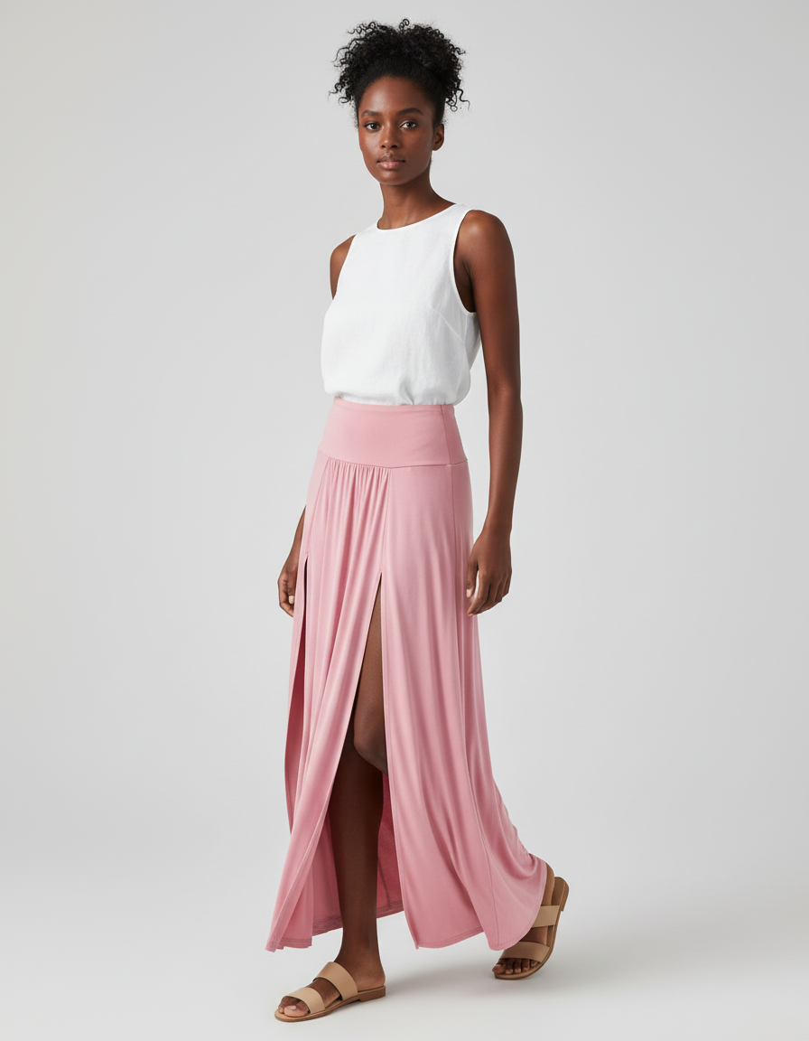 La Jupe Longue Fente Devant, dans sa teinte rose délicate et sa maille fluide, est l'incarnation de l'élégance estivale sans effort. Sa coupe évasée et son tissu léger en font une pièce maîtresse polyvalente pour vos looks du quotidien comme pour des occasions plus spéciales. Pour une journée ensoleillée, associez-la à un débardeur blanc simple et des sandales plates, comme sur l'image, pour un ensemble frais et aéré. En soirée, transformez-la avec un top en soie ajusté, des talons compensés et des bijoux discrets pour une allure sophistiquée, parfaite pour un dîner en terrasse ou un cocktail au bord de l'eau.
