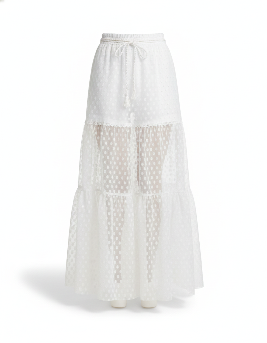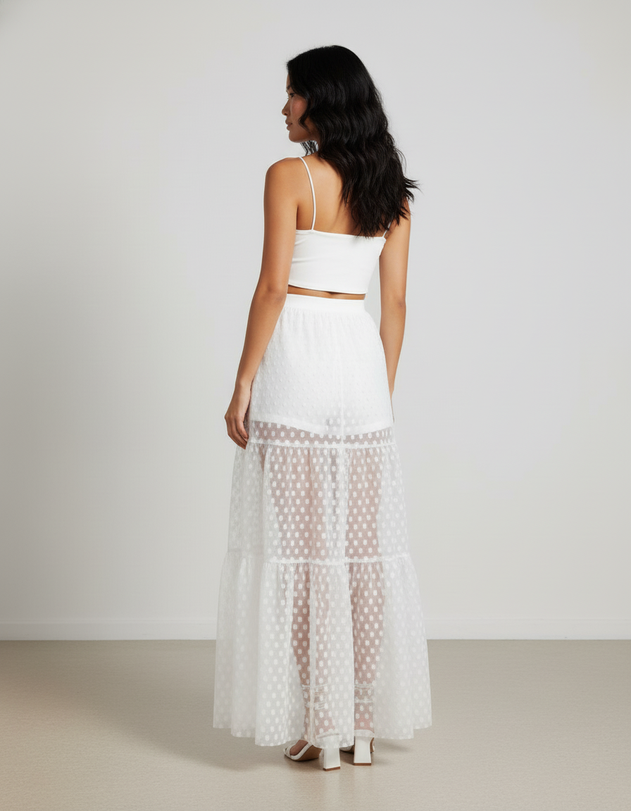 Révolutionnez votre garde-robe estivale avec notre Jupe Longue Avec Short Intégré, une pièce maîtresse qui incarne la grâce moderne et le confort absolu. Conçue pour la femme exigeante qui ne transige pas entre style et bien-être, cette jupe en tulle blanc vaporeux, ornée de délicats volants, offre une silhouette aérienne et sophistiquée. Son design transparent est sublimé par un short intégré, garantissant une discrétion impeccable et une liberté de mouvement inégalée, de jour comme de nuit. La taille élastique assure un ajustement parfait et un confort sans faille, faisant de cette jupe l'alliée idéale pour vos escapades ensoleillées ou vos soirées chics.