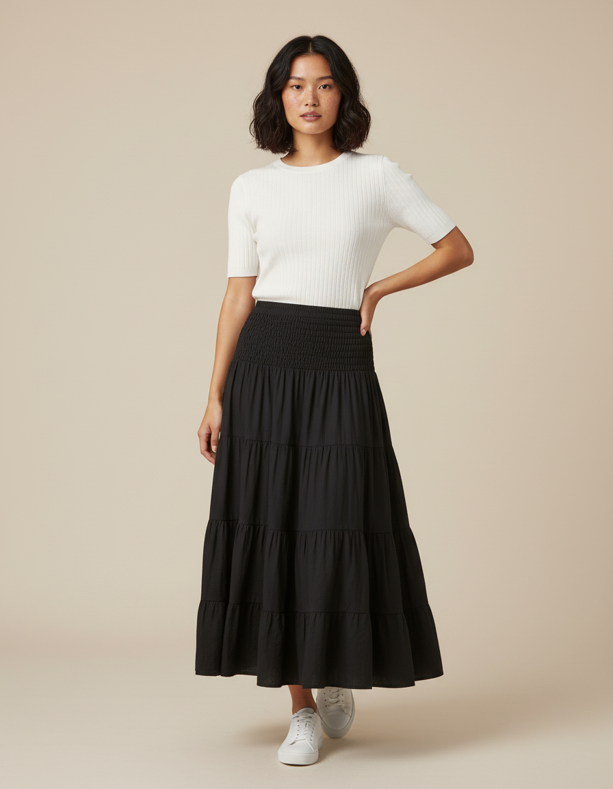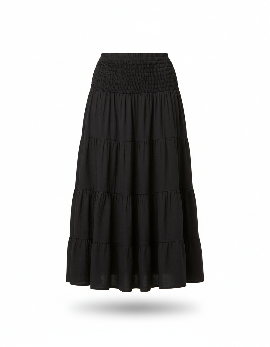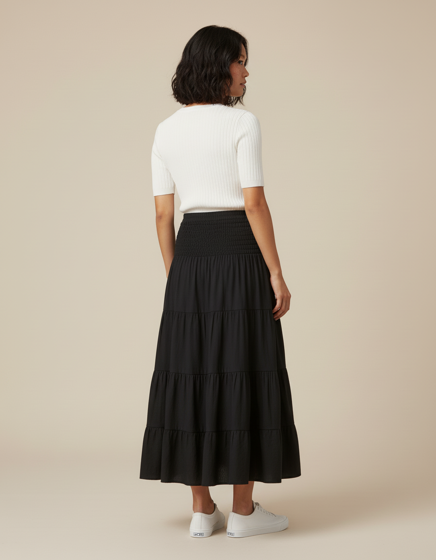 Découvrez la Jupe Longue Baba Cool, une pièce maîtresse en coton noir pur, conçue pour celles qui ne transigent ni sur le style, ni sur le confort. Sa taille élastique innovante épouse délicatement votre silhouette, assurant une liberté de mouvement absolue sans jamais comprimer. Le tombé fluide de ses volants superposés crée une silhouette aérienne et bohème, tandis que la qualité supérieure du coton garantit une sensation de légèreté et de respirabilité tout au long de la journée. Chaque pas est une affirmation de votre aisance naturelle et de votre goût pour l'élégance décontractée.