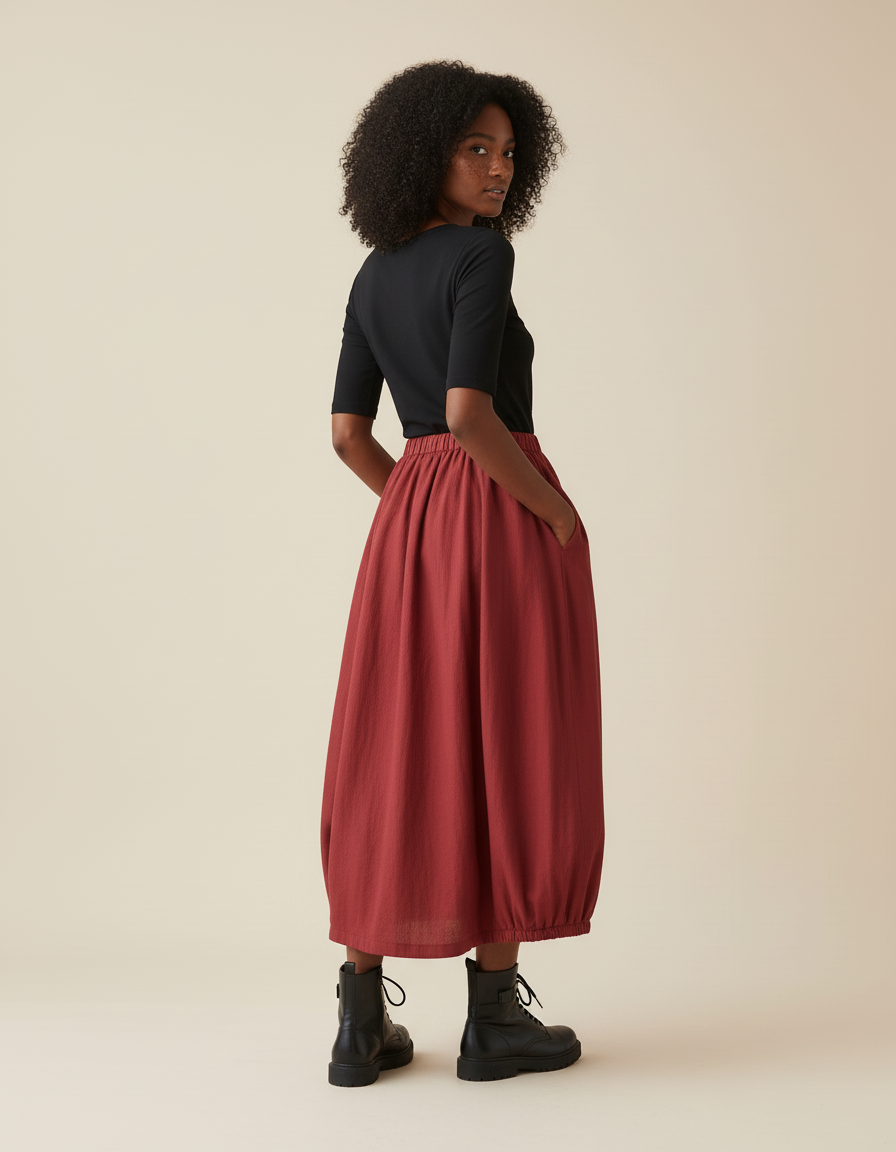 La Jupe Longue Ballon en coton terracotta est une toile vierge pour exprimer votre style personnel. Pour un look de jour décontracté et élégant, associez-la à un simple t-shirt ajusté et des sandales minimalistes ou des baskets épurées. En soirée, transformez-la avec un chemisier en soie fluide et des talons pour une allure sophistiquée et chic. Pour une touche plus audacieuse et contemporaine, comme l'illustre notre modèle, mariez-la avec des bottines lacées. Sa couleur terracotta, riche et chaleureuse, s'adapte à toutes les saisons et se marie harmonieusement avec une palette étendue de teintes, du neutre au plus éclatant.