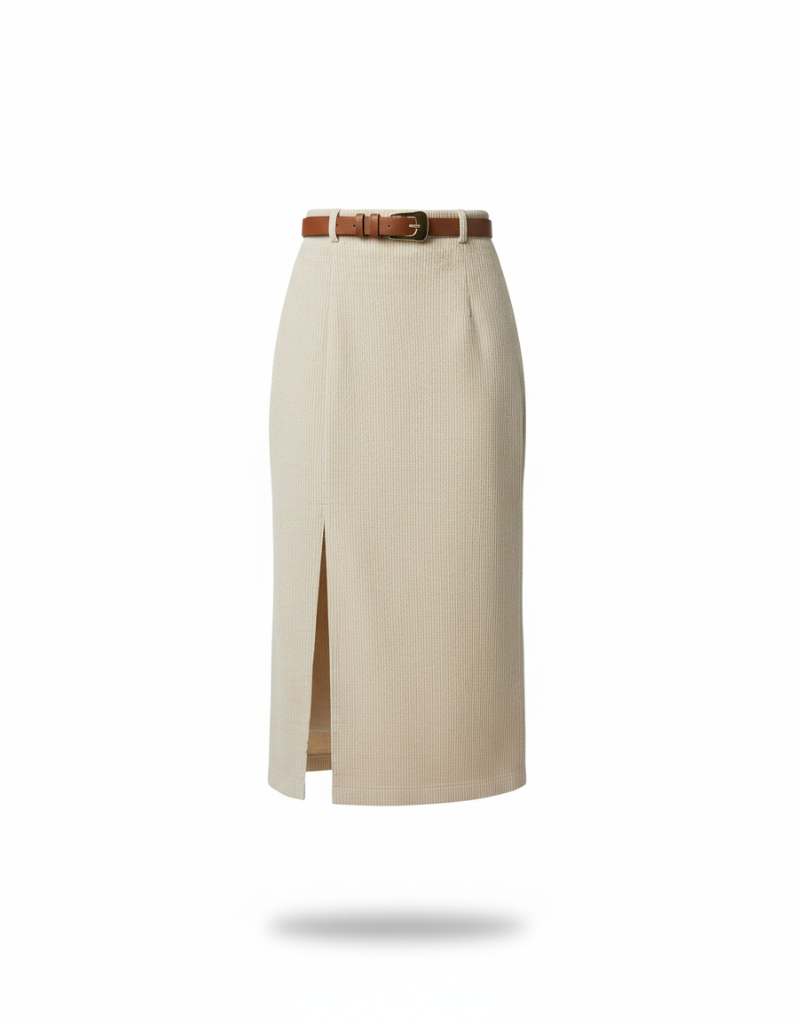 Cette jupe présente une coupe droite et une longueur qui atteint le mollet. Elle est de couleur beige et inclut une fente sur le devant.