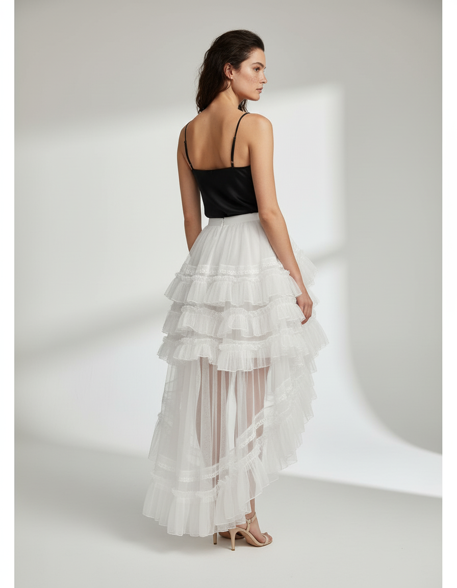 Cette jupe longue est confectionnée en tissu mesh. Elle présente des volants superposés et une coupe asymétrique de type high-low.
