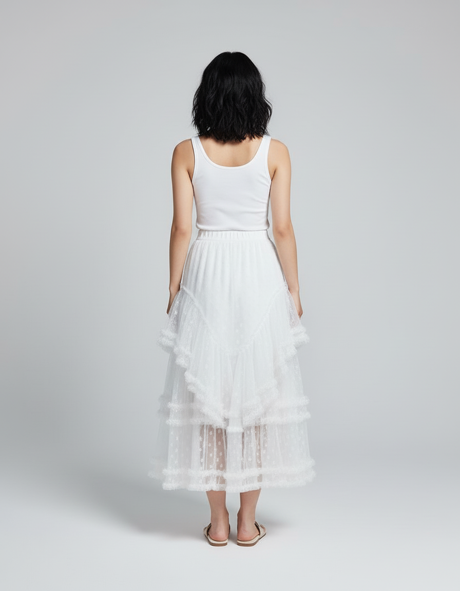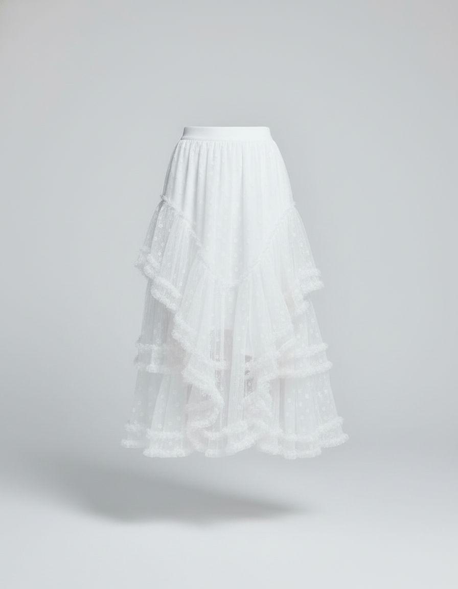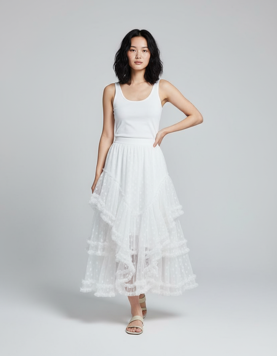 Ce qui distingue notre jupe, c'est l'harmonie parfaite entre la délicatesse du tulle et la structure subtile de ses multiples volants, créant un mouvement hypnotisant à chaque pas. Loin d'une simple jupe blanche, son tissu léger et ses détails raffinés, comme les subtils pois brodés, lui confèrent une texture et une profondeur uniques. Chaque couche est pensée pour apporter volume sans lourdeur, tandis que la coupe longue et fluide garantit une élégance sans effort. C'est la pièce maîtresse d'une garde-robe qui célèbre l'individualité et la beauté intemporelle, versatile pour toutes les occasions.