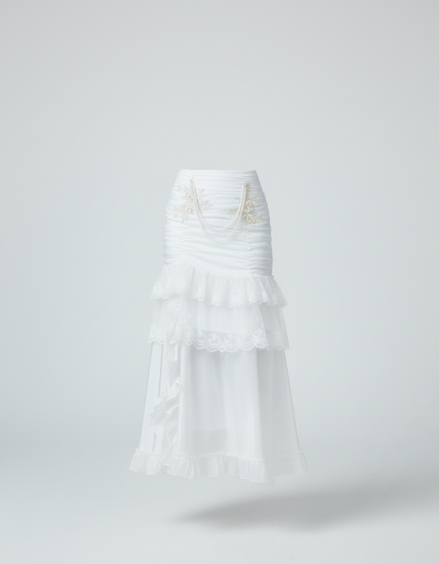 Jupe Longue Blanche Brodée Romantique avec Volants et Dentelle