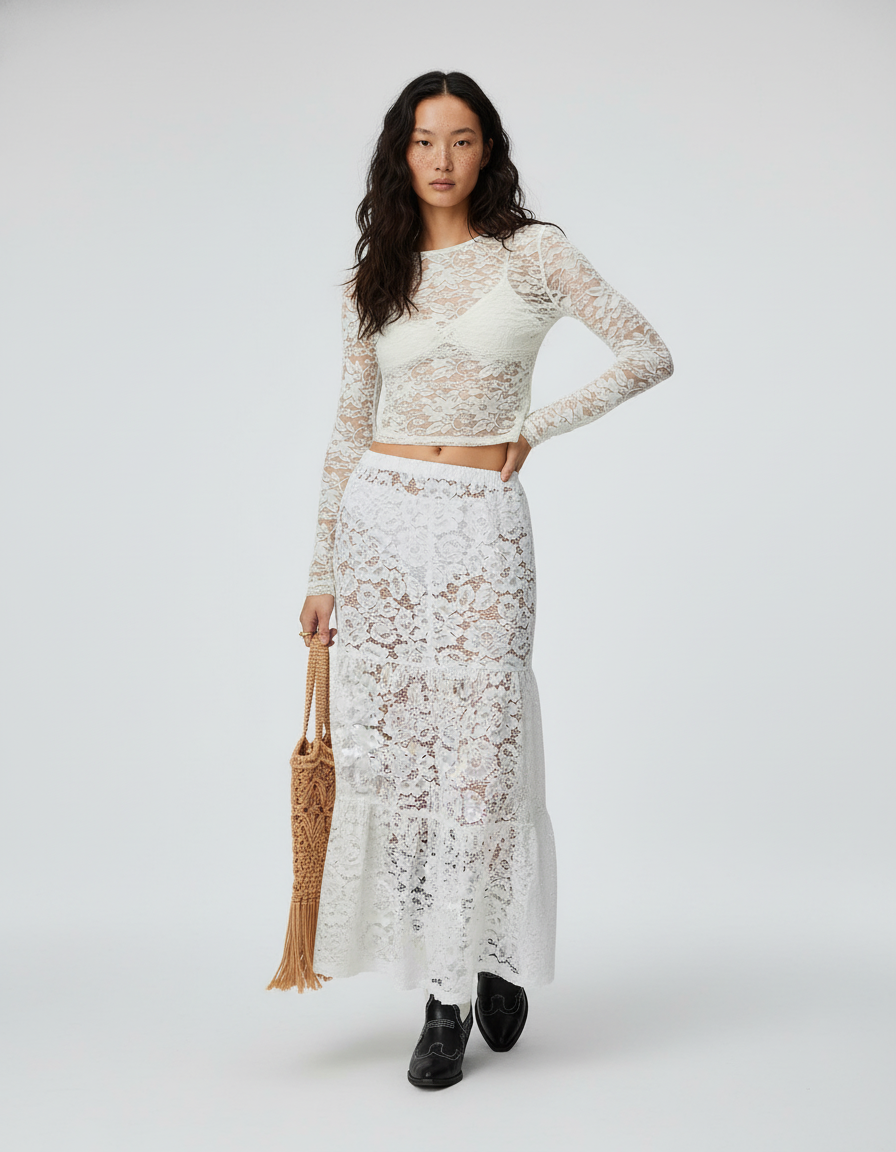 Ajoutez une touche de romance et de style bohème à votre garde-robe avec cette jupe longue en dentelle.