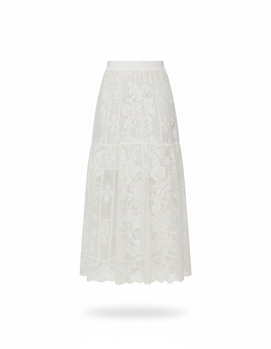 Sublimez votre style avec notre jupe longue en dentelle blanche, une pièce élégante et polyvalente pour vos événements spéciaux.