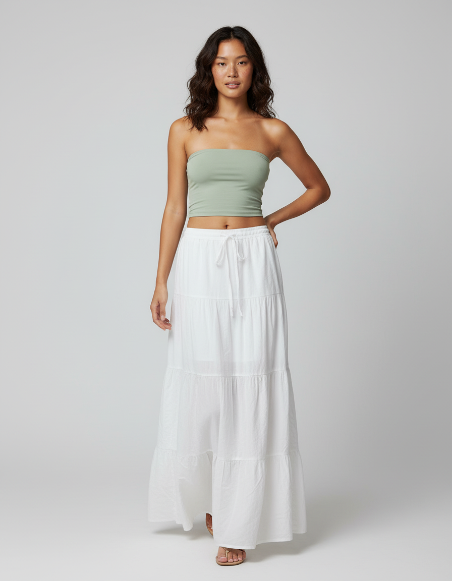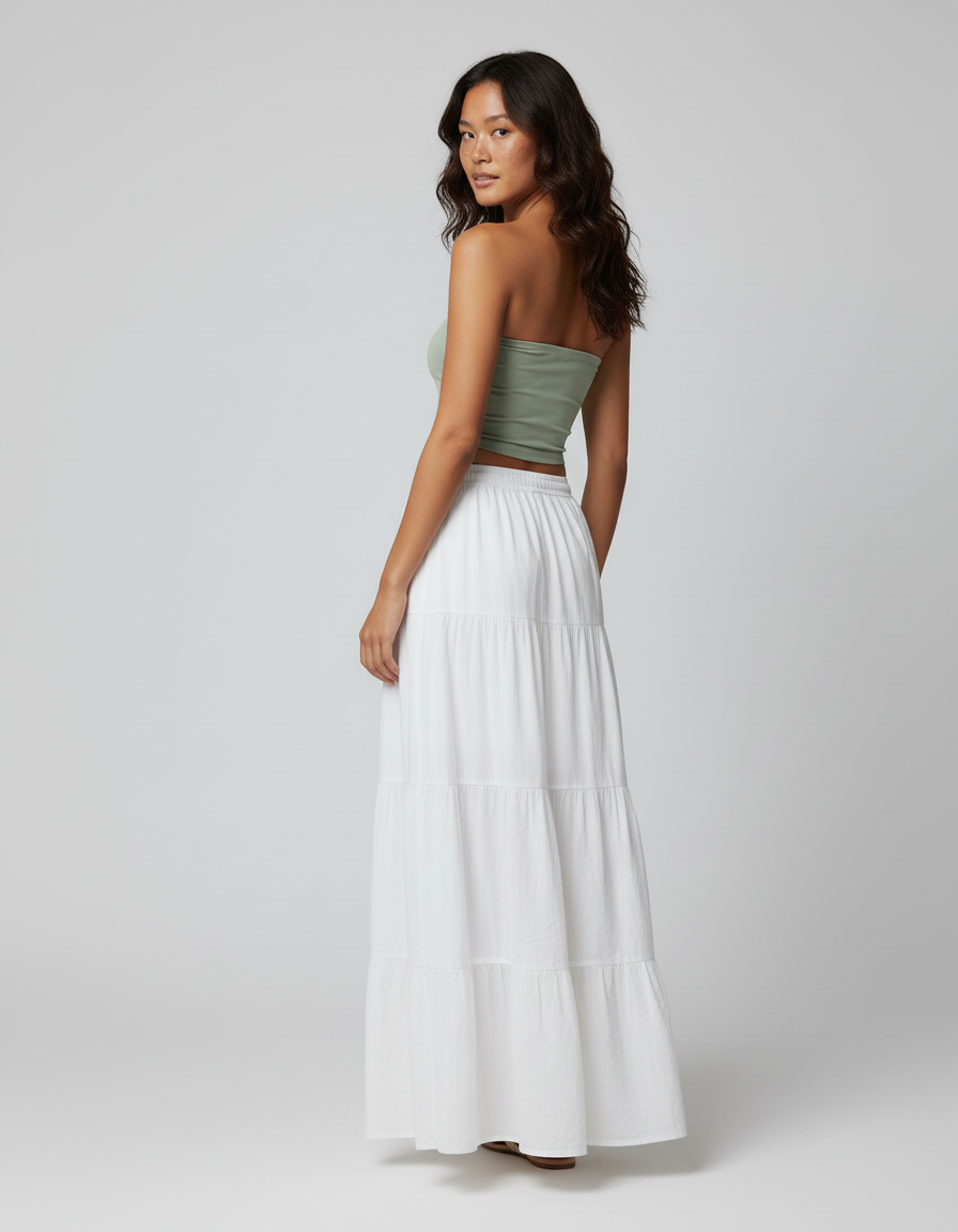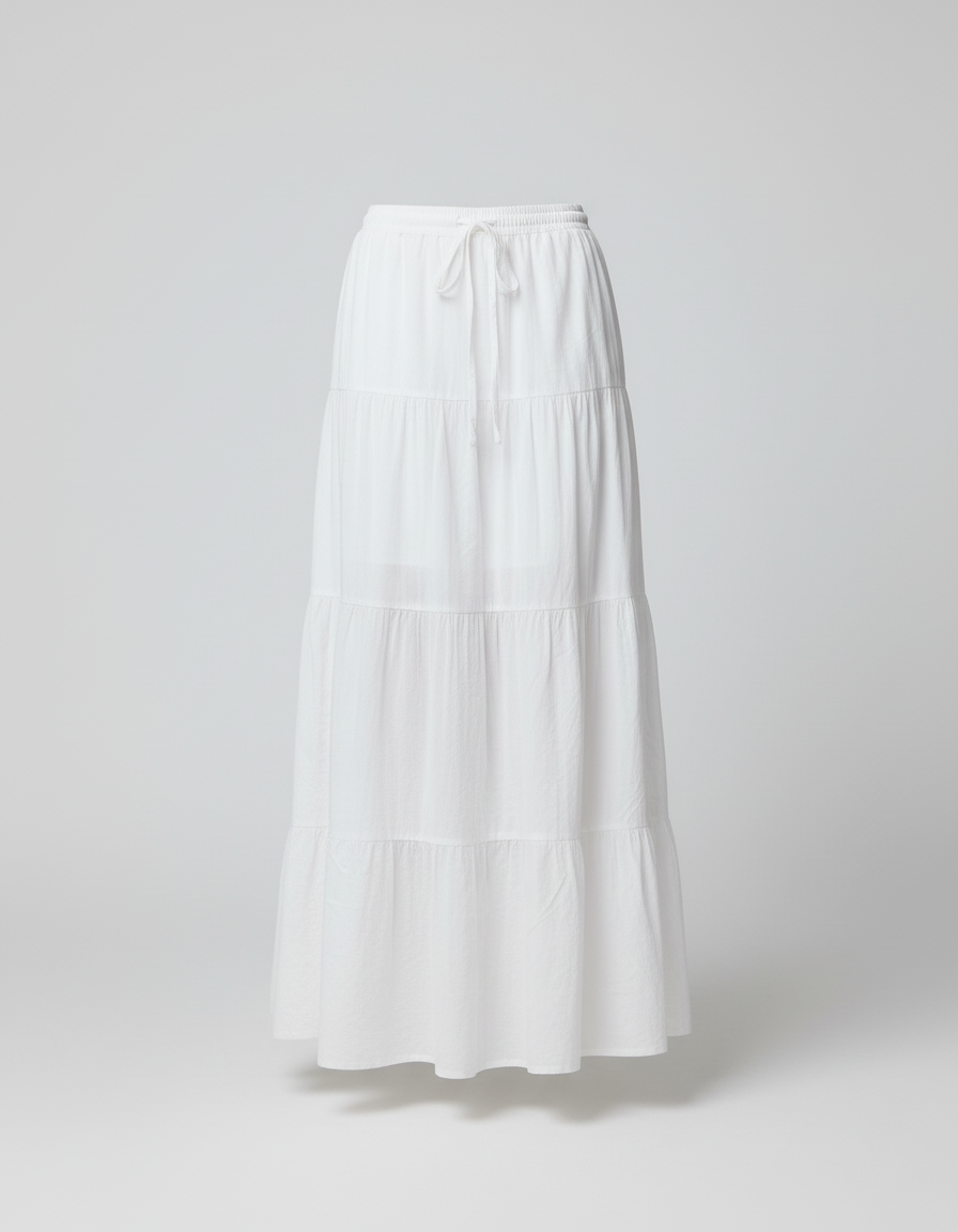 Adoptez un look léger et aéré avec notre jupe longue blanche étagée, parfaite pour la saison estivale.